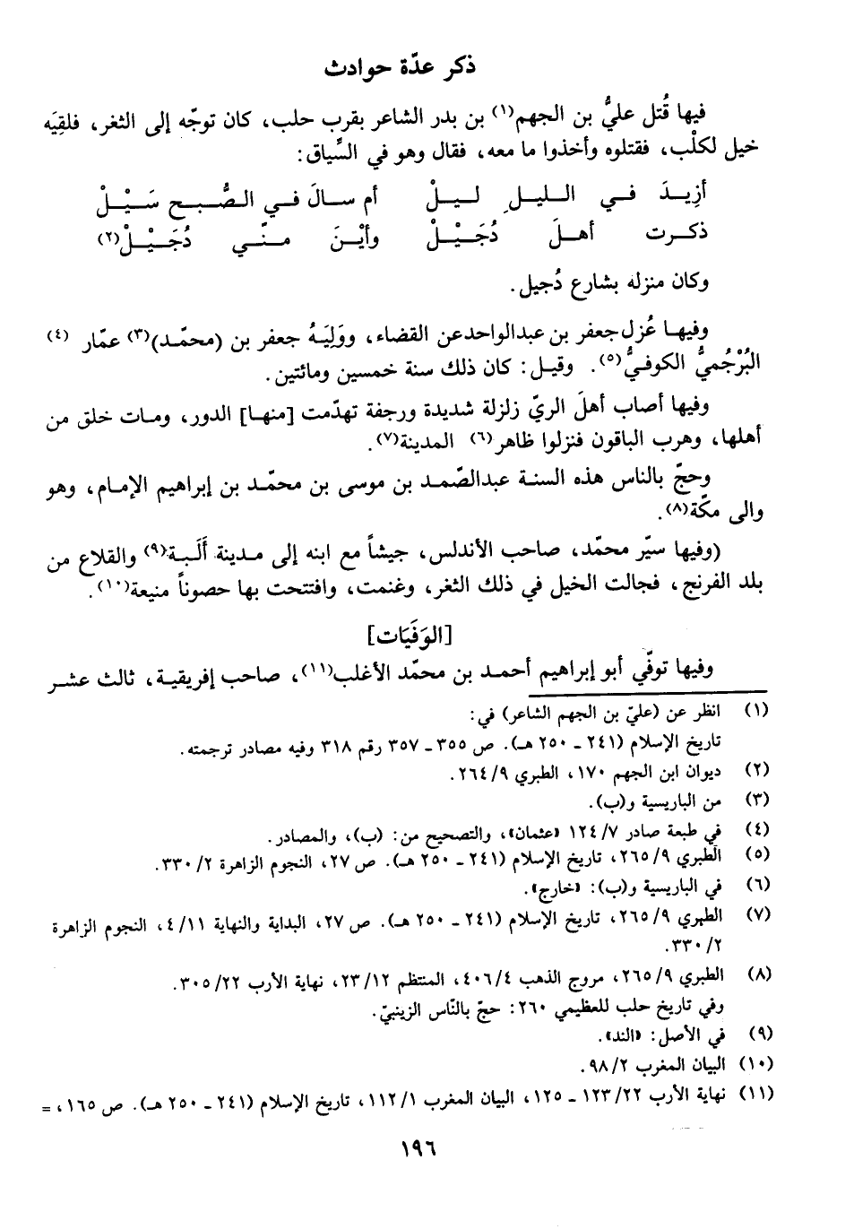فِيهَا قُتِلَ عَلِيُّ بْنُ الْجَهْمِ بْنِ بَدْرٍ الشَّاعِرُ بِقُرْبِ حَلَبَ، كَانَ تَوَجَّهَ إِلَى الثَّغْرِ، فَلَقِيَهُ خَيْلٌ لِكَلْبَ، فَقَتَلُوهُ وَأَخَذُوا مَا مَعَهُ، فَقَالَ وَهُوَ فِي السِّيَاقِ: