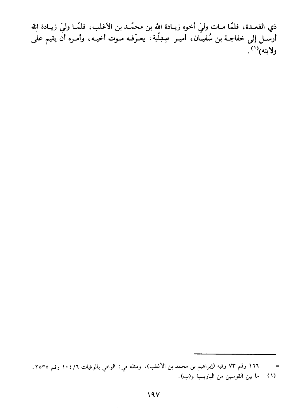 ذِي الْقِعْدَةِ، فَلَمَّا مَاتَ وَلِيَ أَخُوهُ زِيَادَةُ اللَّهِ بْنُ مُحَمَّدِ بْنِ الْأَغْلَبِ، فَلَمَّا وَلِيَ زِيَادَةُ اللَّهِ أَرْسَلَ إِلَى خَفَاجَةَ بْنِ سُفْيَانَ، أَمِيرِ صِقِلِّيَّةَ، يُعَرِّفُهُ مَوْتَ أَخِيهِ، وَأَمَرَهُ أَنْ يُقِيمَ عَلَى وِلَايَتِهِ) .