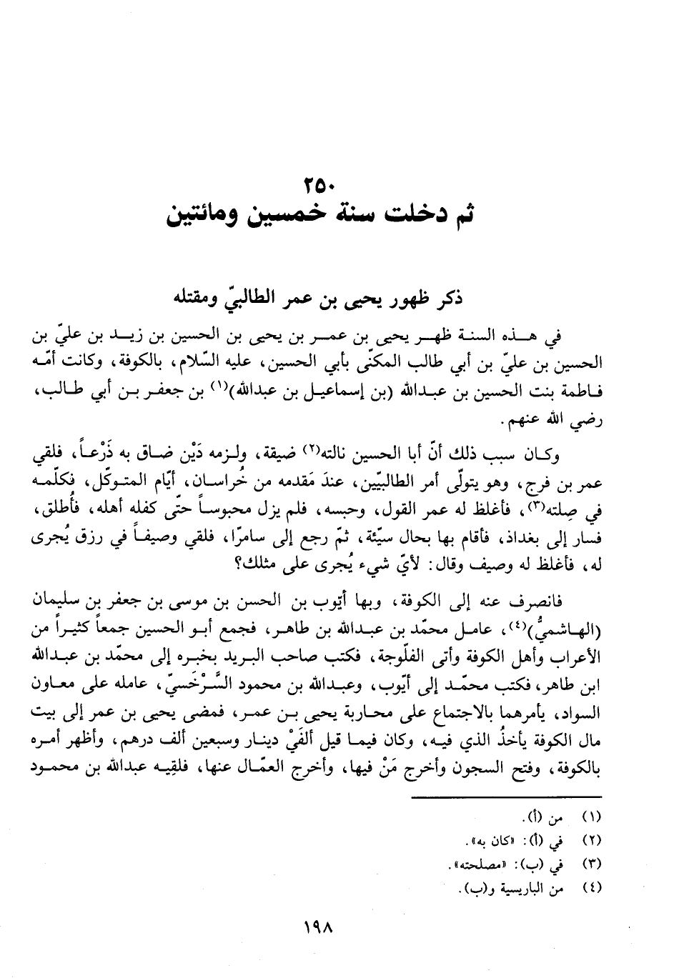 فِي هَذِهِ السَّنَةِ ظَهَرَ يَحْيَى بْنُ عُمَرَ بْنِ يَحْيَى بْنِ الْحُسَيْنِ بْنِ زَيْدِ بْنِ عَلِيِّ بْنِ الْحَسَنِ بْنِ عَلِيِّ بْنِ أَبِي طَالِبٍ الْمُكَنَّى بِأَبِي الْحُسَيْنِ، عَلَيْهِ السَّلَامُ، بِالْكُوفَةِ، وَكَانَتْ أُمُّهُ فَاطِمَةَ بِنْتَ الْحُسَيْنِ بْنِ عَبْدِ اللَّهِ (بْنِ إِسْمَاعِيلَ بْنِ عَبْدِ اللَّهِ) بْنِ جَعْفَرِ بْنِ أَبِي طَالِبٍ، رَضِيَ اللَّهُ عَنْهُمْ.