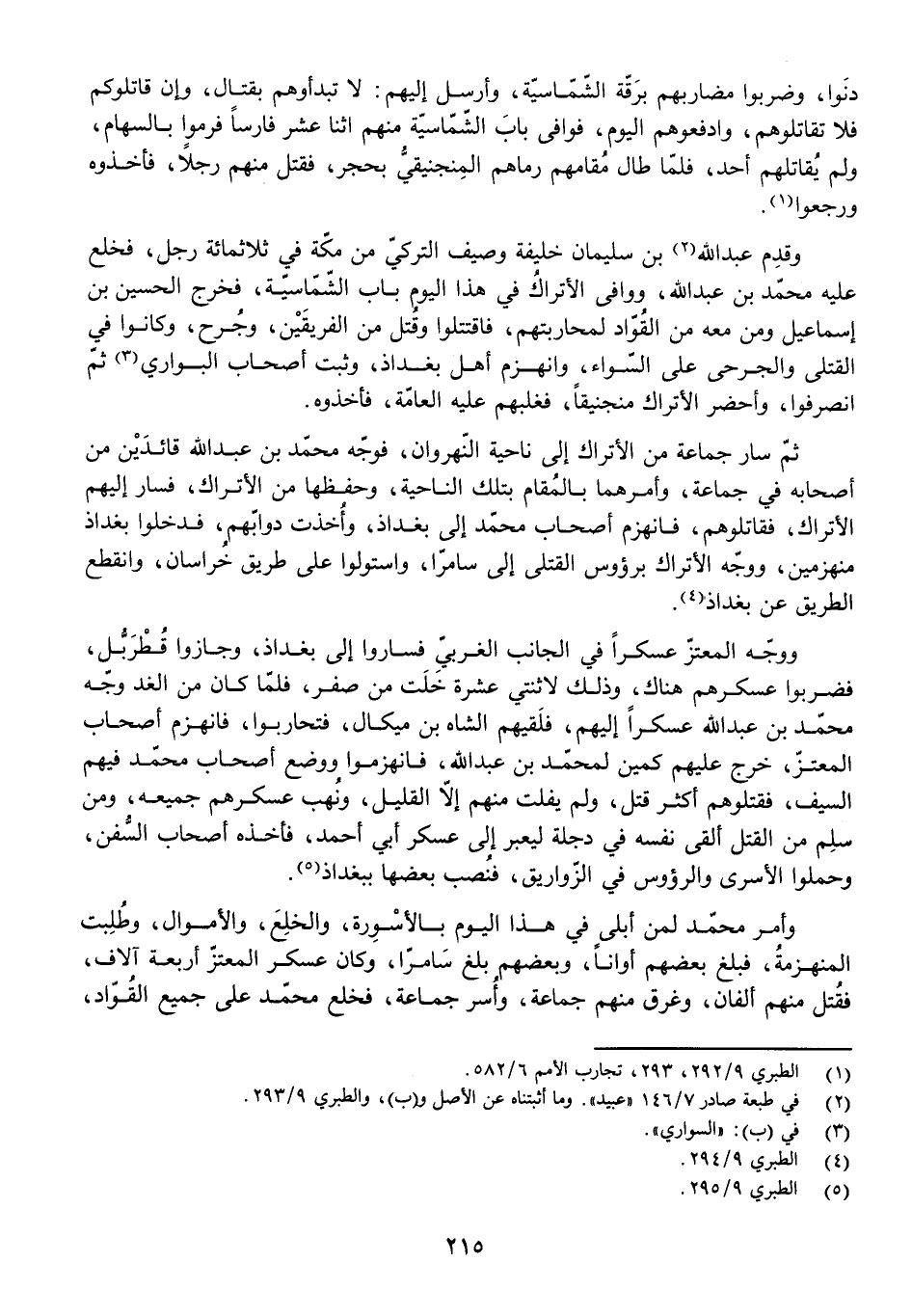وَقَدِمَ عُبَيْدُ اللَّهِ بْنُ سُلَيْمَانَ خَلِيفَةُ وَصِيفٍ التُّرْكِيِّ مِنْ مَكَّةَ فِي ثَلَاثِمِائَةِ رَجُلٍ، فَخَلَعَ عَلَيْهِ مُحَمَّدُ بْنُ عَبْدِ اللَّهِ، وَوَافَى الْأَتْرَاكُ فِي هَذَا الْيَوْمِ بَابَ الشَّمَّاسِيَّةِ، فَخَرَجَ الْحُسَيْنُ بْنُ إِسْمَاعِيلَ وَمَنْ مَعَهُ مِنَ الْقُوَّادِ لِمُحَارَبَتِهِمْ، فَاقْتَتَلُوا وَقُتِلَ مِنَ الْفَرِيقَيْنِ، وَجُرِحَ، وَكَانُوا فِي الْقَتْلَى وَالْجَرْحَى عَلَى السَّوَاءِ، وَانْهَزَمَ أَهْلُ بَغْدَادَ، وَثَبَتَ أَصْحَابُ الْبَوَارِي ثُمَّ انْصَرَفُوا، وَأَحْضَرَ الْأَتْرَاكُ مَنْجَنِيقًا، فَغَلَبَهُمْ عَلَيْهِ الْعَامَّةُ، فَأَخَذُوهُ.