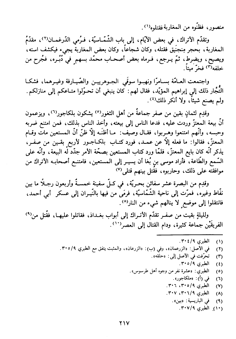 وَلِلَيْلَةٍ بَقِيَتْ مِنْ صَفَرَ تَقَدَّمَ الْأَتْرَاكُ إِلَى أَبْوَابِ بَغْدَادَ، فَقَاتَلُوا عَلَيْهَا، فَقُتِلَ مِنَ الْفَرِيقَيْنِ جَمَاعَةٌ كَثِيرَةٌ، وَدَامَ الْقِتَالُ إِلَى الْعَصْرِ.