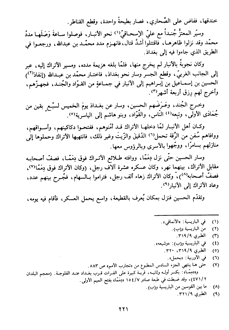 وَخَرَجَ الْجُنْدُ وَعَرَضَهُمُ الْحُسَيْنُ، وَسَارَ عَنْ بَغْدَادَ يَوْمَ الْخَمِيسِ لِسَبْعٍ بَقِينَ مِنْ جُمَادَى الْأُولَى، وَتَبِعَهُ النَّاسُ، وَالْقُوَّادُ، وَبَنُو هَاشِمٍ إِلَى الْيَاسِرِيَّةِ.
