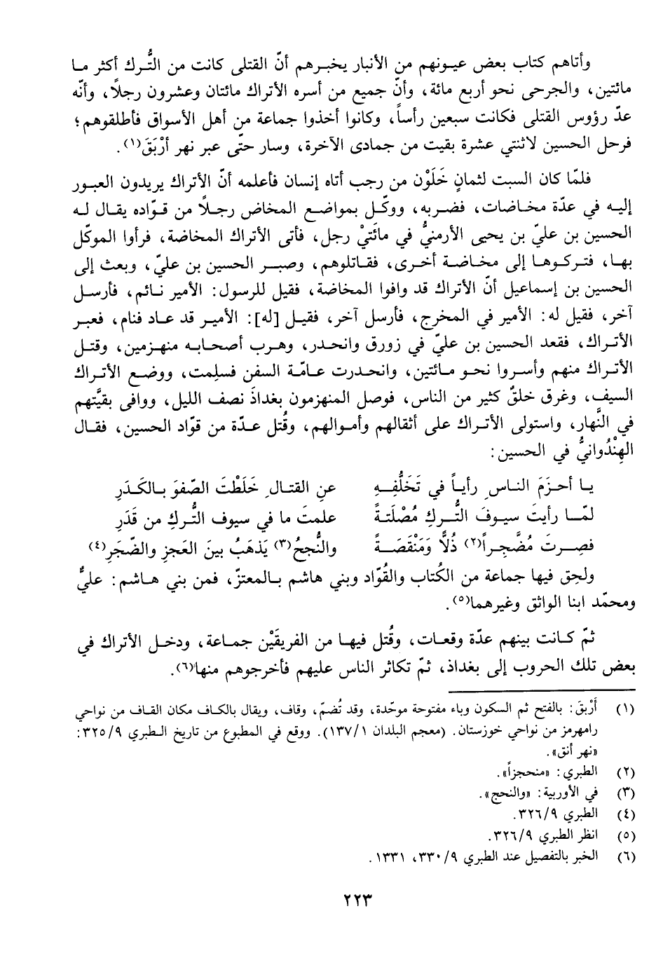 وَأَتَاهُمْ كِتَابُ بَعْضِ عُيُونِهِمْ مِنَ الْأَنْبَارِ يُخْبِرُهُمْ أَنَّ الْقَتْلَى كَانَتْ مِنَ التُّرْكِ أَكْثَرَ مِنْ مِائَتَيْنِ، وَالْجَرْحَى نَحْوَ أَرْبَعِ مِائَةٍ، وَأَنَّ جَمِيعَ مَنْ أَسَرَهُ الْأَتْرَاكُ مِائَتَانِ وَعِشْرُونَ رَجُلًا، وَأَنَّهُ عَدَّ رُؤُوسَ الْقَتْلَى فَكَانَتْ سَبْعِينَ رَأْسًا، وَكَانُوا أَخَذُوا جَمَاعَةً مِنْ أَهْلِ الْأَسْوَاقِ فَأَطْلَقُوهُمْ، فَرَحَلَ الْحُسَيْنُ لِاثْنَتَيْ عَشْرَةَ بَقِيَتْ مِنْ جُمَادَى الْآخِرَةِ، وَسَارَ حَتَّى عَبَرَ نَهَرَ أَرْبَقَ، فَلَمَّا كَانَ السَّبْتُ لِثَمَانٍ خَلَوْنَ مِنْ رَجَبٍ أَتَاهُ إِنْسَانٌ فَأَعْلَمَهُ أَنَّ الْأَتْرَاكَ يُرِيدُونَ الْعُبُورَ إِلَيْهِ فِي عِدَّةِ مَخَاضَاتٍ، فَضَرَبَهُ، وَوَكَّلَ بِمَوَاضِعِ الْمَخَاضِ رَجُلًا مِنْ قُوَّادِهِ يُقَالُ لَهُ الْحُسَيْنُ بْنُ عَلِيِّ بْنِ يَحْيَى الْأَرْمَنِيُّ فِي مِائَتَيْ رَجُلٍ، فَأَتَى الْأَتْرَاكُ الْمَخَاضَةَ، فَرَأَوُا الْمُوكَلَ بِهَا، فَتَرَكُوهَا إِلَى مَخَاضَةٍ أُخْرَى، فَقَاتَلُوهُمْ، وَصَبَرَ الْحُسَيْنُ بْنُ عَلِيٍّ، وَبَعَثَ إِلَى الْحُسَيْنِ بْنِ إِسْمَاعِيلَ أَنَّ الْأَتْرَاكَ قَدْ وَافَوُا الْمَخَاضَةَ، فَقِيلَ لِلرَّسُولِ: الْأَمِيرُ نَائِمٌ، فَأَرْسَلَ آخَرَ، فَقِيلَ لَهُ: الْأَمِيرُ فِي الْمَخْرَجِ، فَأَرْسَلَ آخَرَ، فَقِيلَ [لَهُ] : الْأَمِيرُ قَدْ عَادَ فَنَامَ، فَعَبَرَ الْأَتْرَاكُ، فَقَعَدَ الْحُسَيْنُ بْنُ عَلِيٍّ فِي زَوْرَقٍ وَانْحَدَرَ، وَهَرَبَ أَصْحَابُهُ مُنْهَزِمِينَ، وَقَتَلَ الْأَتْرَاكُ مِنْهُمْ وَأَسَرُوا نَحْوَ مِائَتَيْنِ، وَانْحَدَرَتْ عَامَّةُ السُّفُنِ فَسُلِّمَتْ، وَوَضَعَ الْأَتْرَاكُ السَّيْفَ، وَغَرِقَ خَلْقٌ كَثِيرٌ مِنَ النَّاسِ، فَوَصَلَ الْمُنْهَزِمُونَ بَغْدَادَ نِصْفَ اللَّيْلِ، وَوَافَى بَقِيَّتُهُمْ فِي النَّهَارِ، وَاسْتَوْلَى الْأَتْرَاكُ عَلَى أَثْقَالِهِمْ وَأَمْوَالِهِمْ، وَقُتِلَ عِدَّةٌ مِنْ قُوَّادِ الْحُسَيْنِ، فَقَالَ الْهِنْدُوَانِيُّ فِي الْحُسَيْنِ: