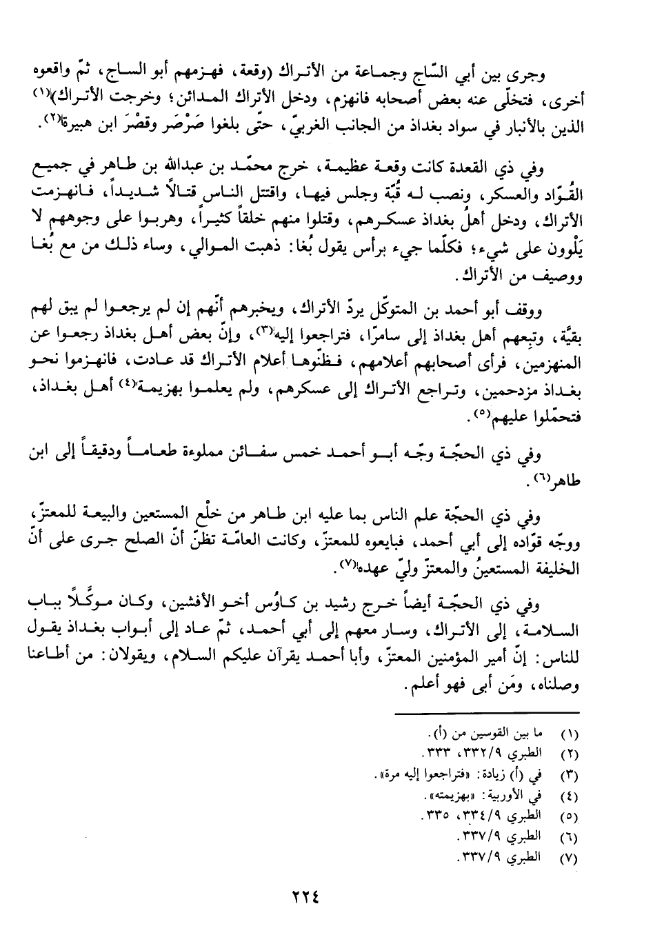 وَوَقَفَ أَبُو أَحْمَدَ بْنُ الْمُتَوَكِّلِ يَرُدُّ الْأَتْرَاكَ، وَيُخْبِرُهُمْ أَنَّهُمْ إِنْ لَمْ يَرْجِعُوا لَمْ يُبْقِ لَهُمْ بَقِيَّةً، وَتَبِعَهُمْ أَهْلُ بَغْدَادَ إِلَى سَامَرَّا، فَتَرَاجَعُوا إِلَيْهِ، وَإِنَّ بَعْضَ أَهْلِ بَغْدَادَ رَجَعُوا عَنِ الْمُنْهَزِمِينَ، فَرَأَى أَصْحَابُهُمْ أَعْلَامَهُمْ، فَظَنُّوهَا أَعْلَامَ الْأَتْرَاكِ قَدْ عَادَتْ، فَانْهَزَمُوا نَحْوَ بَغْدَادَ مُزْدَحِمِينَ، وَتَرَاجَعَ الْأَتْرَاكُ إِلَى عَسْكَرِهِمْ، وَلَمْ يَعْلَمُوا بِهَزِيمَةِ أَهْلِ بَغْدَادَ، فَتَحَمَّلُوا عَلَيْهِمْ.