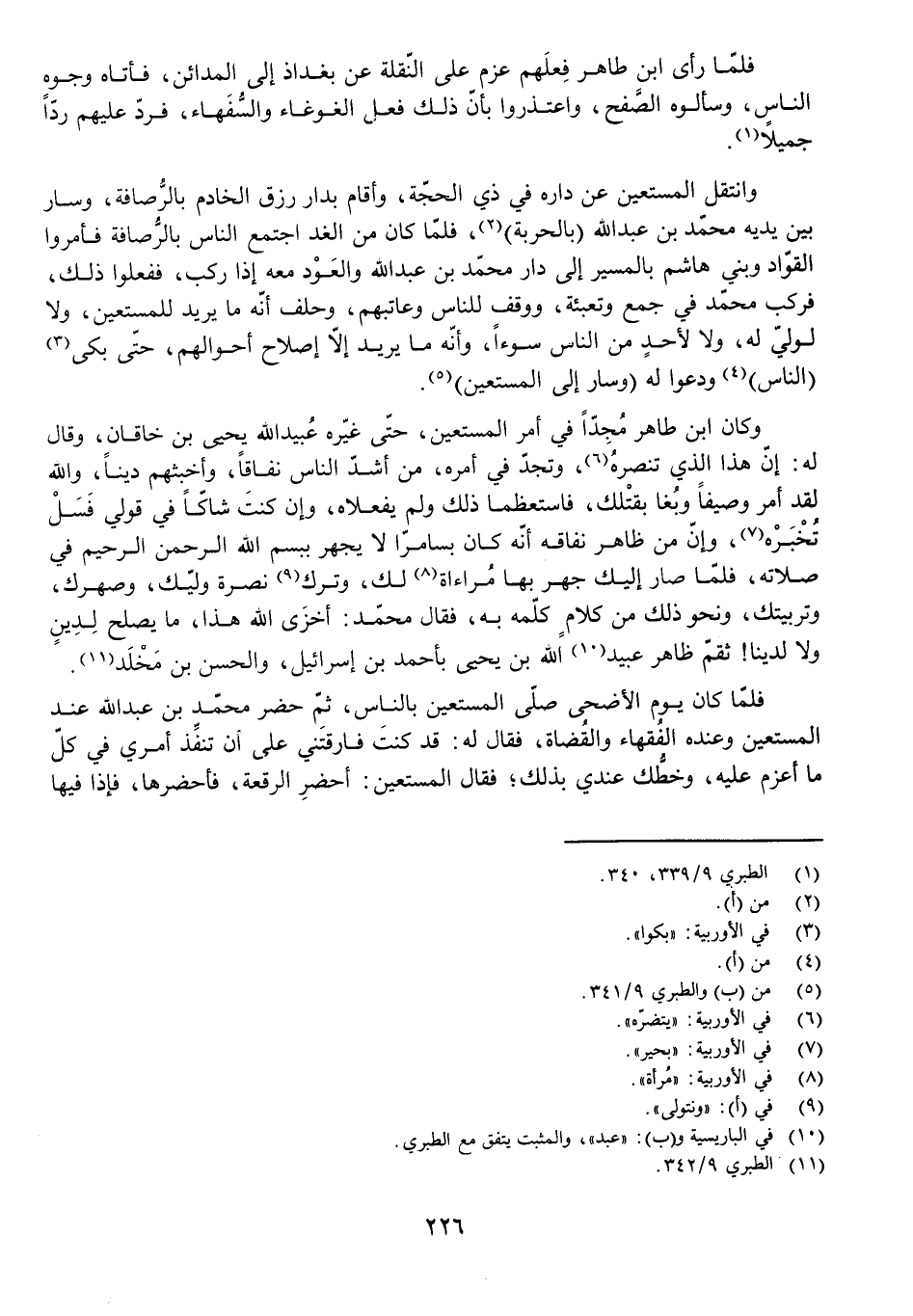 فَلَمَّا كَانَ يَوْمُ الْأَضْحَى صَلَّى الْمُسْتَعِينُ بِالنَّاسِ، ثُمَّ حَضَرَ مُحَمَّدُ بْنُ عَبْدِ اللَّهِ عِنْدَ الْمُسْتَعِينِ وَعِنْدَ الْفُقَهَاءِ وَالْقُضَاةِ، فَقَالَ لَهُ: قَدْ كُنْتَ فَارَقْتَنِي عَلَى أَنْ تُنَفِّذَ أَمْرِي فِي كُلِّ مَا أَعْزِمُ عَلَيْهِ، وَخَطُّكَ عِنْدِي بِذَلِكَ، فَقَالَ الْمُسْتَعِينُ: أَحْضِرِ الرُّقْعَةَ، فَأَحْضَرَهَا، فَإِذَا فِيهَا