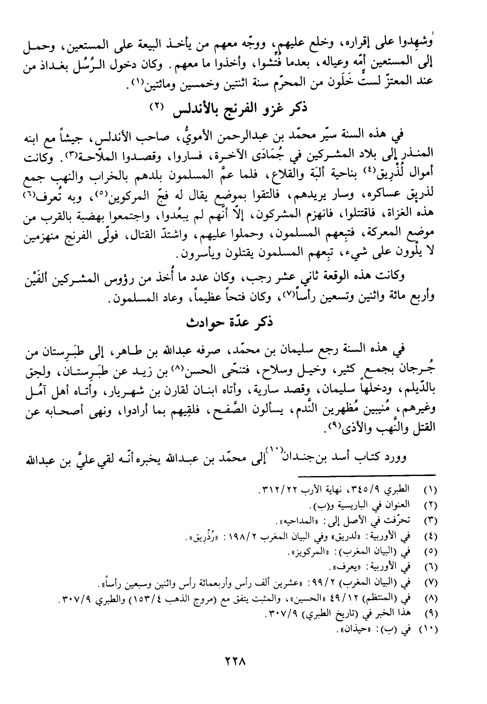 فِي هَذِهِ السَّنَةِ سَيَّرَ مُحَمَّدُ بْنُ عَبْدِ الرَّحْمَنِ الْأُمَوِيُّ، صَاحِبُ الْأَنْدَلُسِ، جَيْشًا مَعَ ابْنِهِ الْمُنْذِرِ إِلَى بِلَادِ الْمُشْرِكِينَ فِي جُمَادَى الْآخِرَةَ، فَسَارُوا، وَقَصَدُوا الْمِلَاحَةَ، وَكَانَتْ أَمْوَالٌ لِذُرَيقٍ بِنَاحِيَةِ أُلْبَةَ وَالْقِلَاعِ، فَلَمَّا عَمَّ الْمُسْلِمُونَ بَلَدَهُمْ بِالْخَرَابِ وَالنَّهْبِ، جُمِعَ لِذُرَيْقٍ عَسَاكِرُهُ، وَسَارَ يُرِيدُهُمْ، فَالْتَقَوْا بِمَوْضِعٍ يُقَالُ لَهُ فَجَّ الْمَرْكُوَّيْنِ، وَبِهِ تُعْرَفُ هَذِهِ الْغَزَاةُ، فَاقْتَتَلُوا، فَانْهَزَمَ الْمُشْرِكُونَ، إِلَّا أَنَّهُمْ لَمْ يَبْعُدُوا، وَاجْتَمَعُوا بِهَضْبَةٍ بِالْقُرْبِ مِنْ مَوْضِعِ الْمَعْرَكَةِ، فَتَبِعَهُمُ الْمُسْلِمُونَ، وَحَمَلُوا عَلَيْهِمْ، وَاشْتَدَّ الْقِتَالُ، فَوَلَّى الْفِرِنْجُ مُنْهَزِمِينَ لَا يَلْوُونَ عَلَى شَيْءٍ. وَتَبِعَهُمُ الْمُسْلِمُونَ يَقْتُلُونَ وَيَأْسِرُونَ.