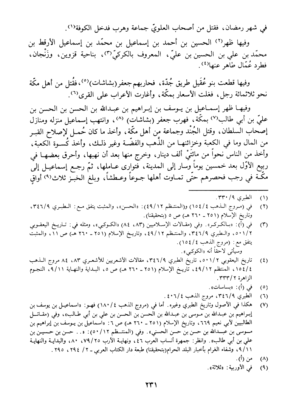 وَفِيهَا ظَهَرَ إِسْمَاعِيلُ بْنُ يُوسُفَ بْنِ إِبْرَاهِيمَ بْنِ عَبْدِ اللَّهِ بْنِ الْحَسَنِ بْنِ الْحَسَنِ بْنِ عَلِيِّ بْنِ أَبِي طَالِبٍ بِمَكَّةَ، فَهَرَبَ جَعْفَرٌ (بِشَاشَاتَ) ، وَانْتَهَبَ إِسْمَاعِيلُ مُنْزِلَهُ وَمَنَازِلَ أَصْحَابِ السُّلْطَانِ، وَقَتَلَ الْجُنْدَ وَجَمَاعَةً مِنْ أَهْلِ مَكَّةَ، وَأَخَذَ مَا كَانَ حَمَلَ لِإِصْلَاحِ الْقَبْرِ مِنَ الْمَالِ وَمَا فِي الْكَعْبَةِ وَخَزَائِنِهَا مِنَ الذَّهَبِ وَالْفِضَّةِ وَغَيْرِ ذَلِكَ، وَأَخَذَ كُسْوَةَ الْكَعْبَةِ، وَأَخَذَ مِنَ النَّاسِ نَحْوًا مِنْ مِائَتَيْ أَلْفِ دِينَارٍ، وَخَرَجَ مِنْهَا بَعْدَ أَنْ نَهَبَهَا، وَأَحْرَقَ بَعْضَهَا فِي رَبِيعٍ الْأَوَّلِ بَعْدَ خَمْسِينَ يَوْمًا وَسَارَ إِلَى الْمَدِينَةِ، فَتَوَارَى عَامِلُهَا، ثُمَّ رَجَعَ إِسْمَاعِيلُ إِلَى مَكَّةَ فِي رَجَبٍ فَحَصَرَهُمْ حَتَّى تَمَاوَتَ أَهْلُهَا جُوعًا وَعَطَشًا، وَبَلَغَ الْخُبْزُ ثَلَاثَ أَوَاقٍ