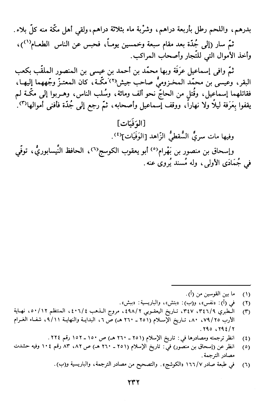وَإِسْحَاقُ بْنُ مَنْصُورِ بْنِ بَهْرَامَ أَبُو يَعْقُوبَ الْكَوْسَجُ، الْحَافِظُ النَّيْسَابُورِيُّ، تُوُفِّيَ فِي جُمَادَى الْأُولَى، وَلَهُ مُسْنَدٌ يُرْوَى عَنْهُ.