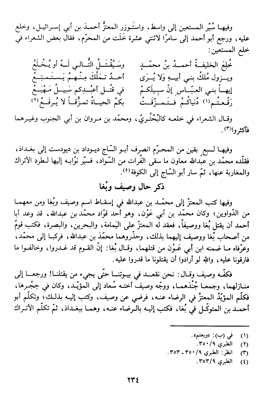 فَكَفَّهُ وَصِيفٌ وَقَالَ: نَحْنُ فِي بُيُوتِنَا حَتَّى يَجِيءَ مَنْ يَقْتُلُنَا! وَرَجَعَا إِلَى مَنْزِلِهِمَا، وَجَمَعَا جُنْدَهَمَا، وَوَجَّهَ وَصِيفٌ أُخْتَهُ سُعَادَ إِلَى الْمُؤَيَّدِ، وَكَانَ فِي حِجْرِهَا، فَكَلَّمَ الْمُؤَيِّدُ الْمُعْتَزَّ فِي الرِّضَاءِ عَنْهُ، فَرَضِيَ عَنْ وَصِيفٍ، وَكَتَبَ إِلَيْهِ بِذَلِكَ، وَتَكَلَّمَ أَبُو أَحْمَدَ بْنُ الْمُتَوَكِّلِ فِي بُغَا، فَكَتَبَ إِلَيْهِ بِالرِّضَاءِ عَنْهُ، وَهُمَا بِبَغْدَاذَ، ثُمَّ تَكَلَّمَ الْأَتْرَاكُ