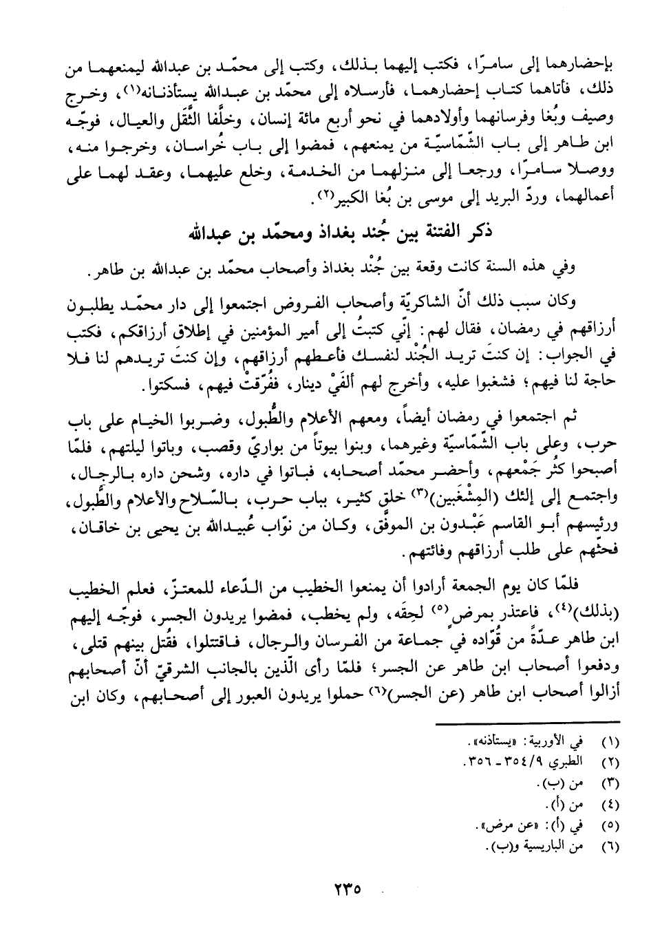بِإِحْضَارِهِمَا إِلَى سَامَرَّا، فَكَتَبَ إِلَيْهِمَا بِذَلِكَ، وَكَتَبَ إِلَى مُحَمَّدٍ لِيَمْنَعَهُمَا مِنْ ذَلِكَ، فَأَتَاهُمَا كِتَابُ إِحْضَارِهِمَا، فَأَرْسَلَاهُ إِلَى مُحَمَّدِ بْنِ عَبْدِ اللَّهِ يَسْتَأْذِنَانِهِ، وَخَرَجَ وَصِيفٌ وَبُغَا وَفُرْسَانُهُمَا وَأَوْلَادُهُمَا فِي نَحْوِ أَرْبَعِ مِائَةِ إِنْسَانٍ، وَخَلَّفَا الثِّقْلَ وَالْعِيَالَ، فَوَجَّهَ ابْنُ طَاهِرٍ إِلَى بَابِ الشَّمَّاسِيَّةِ مَنْ يَمْنَعُهُمْ، فَمَضَوْا إِلَى بَابِ خُرَاسَانَ، وَخَرَجُوا مِنْهُ، وَوَصَلَا سَامَرَّا، وَرَجَعَا إِلَى مَنْزِلِهِمَا مِنَ الْخِدْمَةِ، وَخَلَعَ عَلَيْهِمَا، وَعَقَدَ لَهُمَا عَلَى أَعْمَالِهِمَا، وَرَدَّ الْبَرِيدَ إِلَى مُوسَى بْنِ بُغَا الْكَبِيرِ.