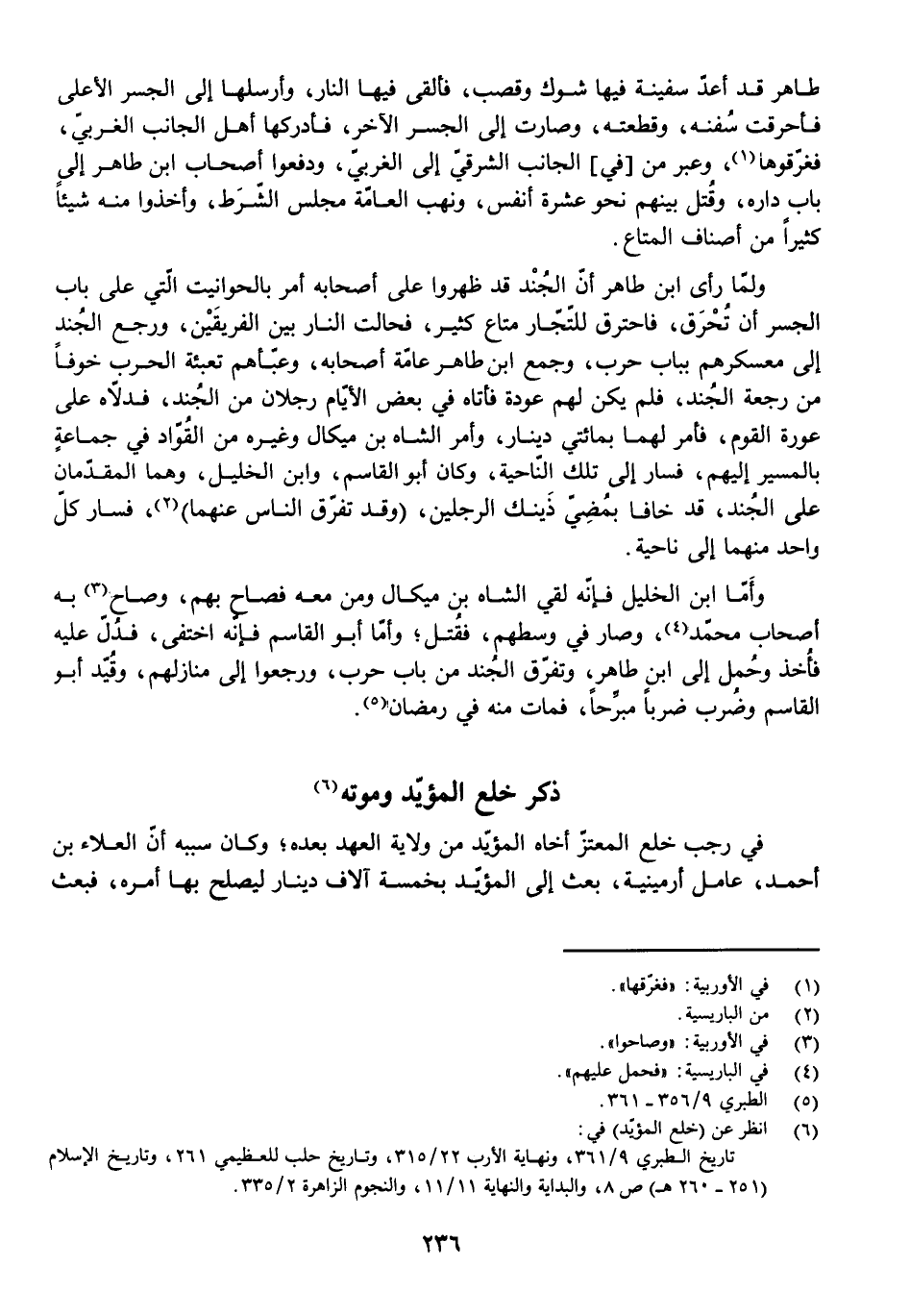 طَاهِرٍ قَدْ أَعَدَّ سَفِينَةً فِيهَا شَوْكٌ وَقَصَبٌ، فَأَلْقَى فِيهَا النَّارَ، وَأَرْسَلَهَا إِلَى الْجِسْرِ الْأَعْلَى فَأَحْرَقَتْ سُفُنَهُ، وَقَطَّعَتْهُ، وَصَارَتْ إِلَى الْجِسْرِ الْآخَرِ، فَأَدْرَكَهَا أَهْلُ الْجَانِبِ الْغَرْبِيِّ، فَغَرَّقُوهَا، وَعَبَرَ مَنْ [فِي] الْجَانِبِ الشَّرْقِيِّ إِلَى الْغَرْبِيِّ، وَدَفَعُوا أَصْحَابَ ابْنِ طَاهِرٍ إِلَى بَابِ دَارِهِ، وَقُتِلَ بَيْنَهُمْ نَحْوُ عَشَرَةِ أَنْفُسٍ، وَنَهَبَ الْعَامَّةُ مَجْلِسَ الشُّرْطِ، وَأَخَذُوا مِنْهُ شَيْئًا كَثِيرًا مِنْ أَصْنَافِ الْمَتَاعِ.