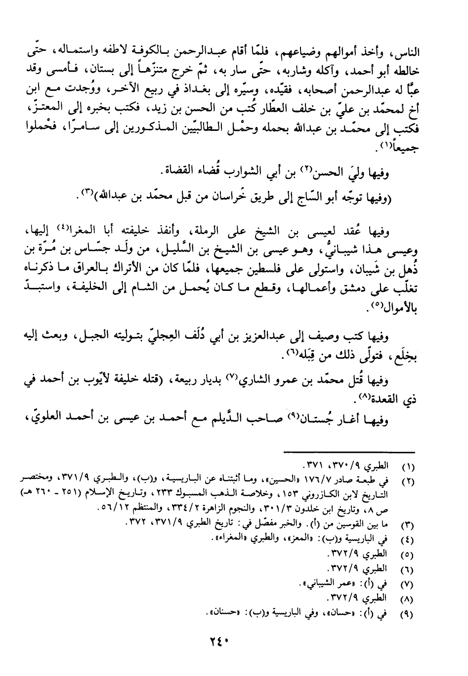 النَّاسَ، وَأَخَذَ أَمْوَالَهُمْ وَضِيَاعَهُمْ، فَلَمَّا أَقَامَ عَبْدُ الرَّحْمَنِ بِالْكُوفَةِ لَاطَفَهُ وَاسْتَمَالَهُ، حَتَّى خَالَطَهُ أَبُو أَحْمَدَ، وَآكَلَهُ وَشَارَبَهُ، حَتَّى سَارَ بِهِ، ثُمَّ خَرَجَ مُتَنَزِّهًا إِلَى بُسْتَانٍ، فَأَمْسَى وَقَدْ عَبَّأَ لَهُ عَبْدُ الرَّحْمَنِ أَصْحَابَهُ، فَقَيَّدَهُ، وَسَيَّرَهُ إِلَى بَغْدَادَ فِي رَبِيعٍ الْآخِرِ، وَوُجِدَتْ مَعَ ابْنِ أَخٍ لِمُحَمَّدِ بْنِ عَلِيِّ بْنِ خَلَفٍ الْعَطَّارِ كُتُبٌ مِنَ الْحَسَنِ بْنِ زَيْدٍ، فَكَتَبَ بِخَبَرِهِ إِلَى الْمُعْتَزِّ، فَكَتَبَ إِلَى مُحَمَّدِ بْنِ عَبْدِ اللَّهِ بِحَمْلِهِ وَحَمْلِ الطَّالِبِيِّينَ الْمَذْكُورِينَ إِلَى سَامَرَّا، فَحُمِلُوا جَمِيعًا.