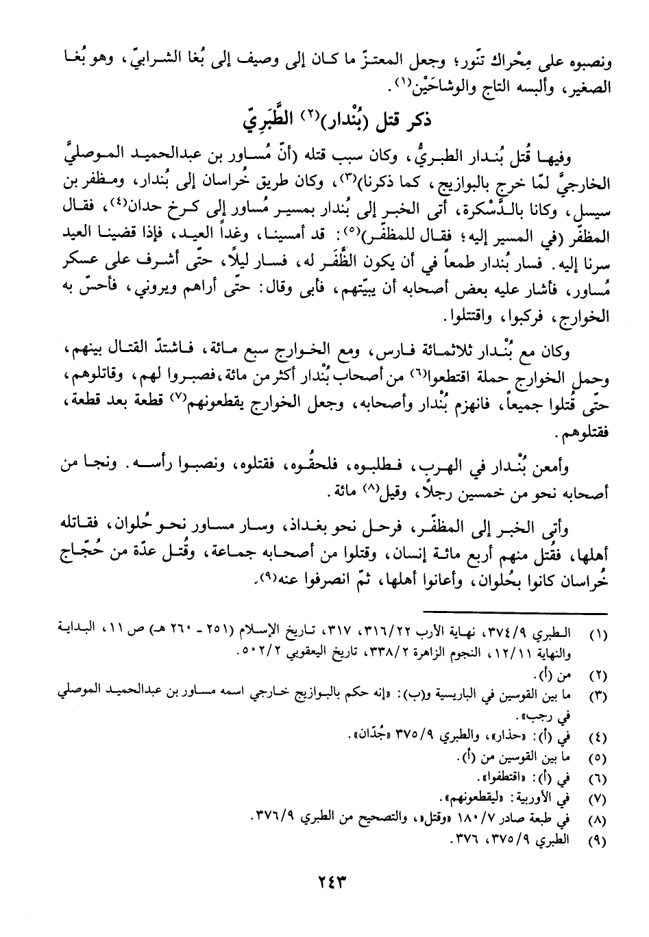 وَفِيهَا قُتِلَ بُنْدَارُ الطَّبَرَيُّ، وَكَانَ سَبَبُ قَتْلِهِ (أَنَّ مُسَاوِرَ بْنَ عَبْدِ الْحَمِيدِ الْمَوْصِلِيَّ الْخَارِجِيَّ لَمَّا خَرَجَ بِالْبَوَازِيجِ، كَمَا ذَكَرْنَا) ، وَكَانَ طَرِيقُ خُرَاسَانَ إِلَى بُنْدَارٍ، وَمُظَفَّرِ بْنِ سَيْسَلٍ، وَكَانَا بِالدَّسْكَرَةِ، أَتَى الْخَبَرُ إِلَى بُنْدَارٍ بِمَسِيرِ مُسَاوِرٍ إِلَى كَرْخِ حَدَّانِ، فَقَالَ الْمُظَفَّرُ (فِي الْمَسِيرِ إِلَيْهِ، فَقَالَ لِلْمُظَفَّرِ) : قَدْ أَمْسَيْنَا، وَغَدًا الْعِيدُ، فَإِذَا قَضَيْنَا الْعِيدَ سِرْنَا إِلَيْهِ. فَسَارَ بُنْدَارٌ طَمَعًا فِي أَنْ يَكُونَ الظَّفَرُ لَهُ، فَسَارَ لَيْلًا، حَتَّى أَشْرَفَ عَلَى عَسْكَرِ مُسَاوِرٍ، فَأَشَارَ عَلَيْهِ بَعْضُ أَصْحَابِهِ أَنْ يُبَيِّتَهُمْ، فَأَبَى وَقَالَ: حَتَّى أَرَاهُمْ وَيَرَوْنِي، فَأَحَسَّ بِهِ الْخَوَارِجُ، فَرَكِبُوا، وَاقْتَتَلُوا.