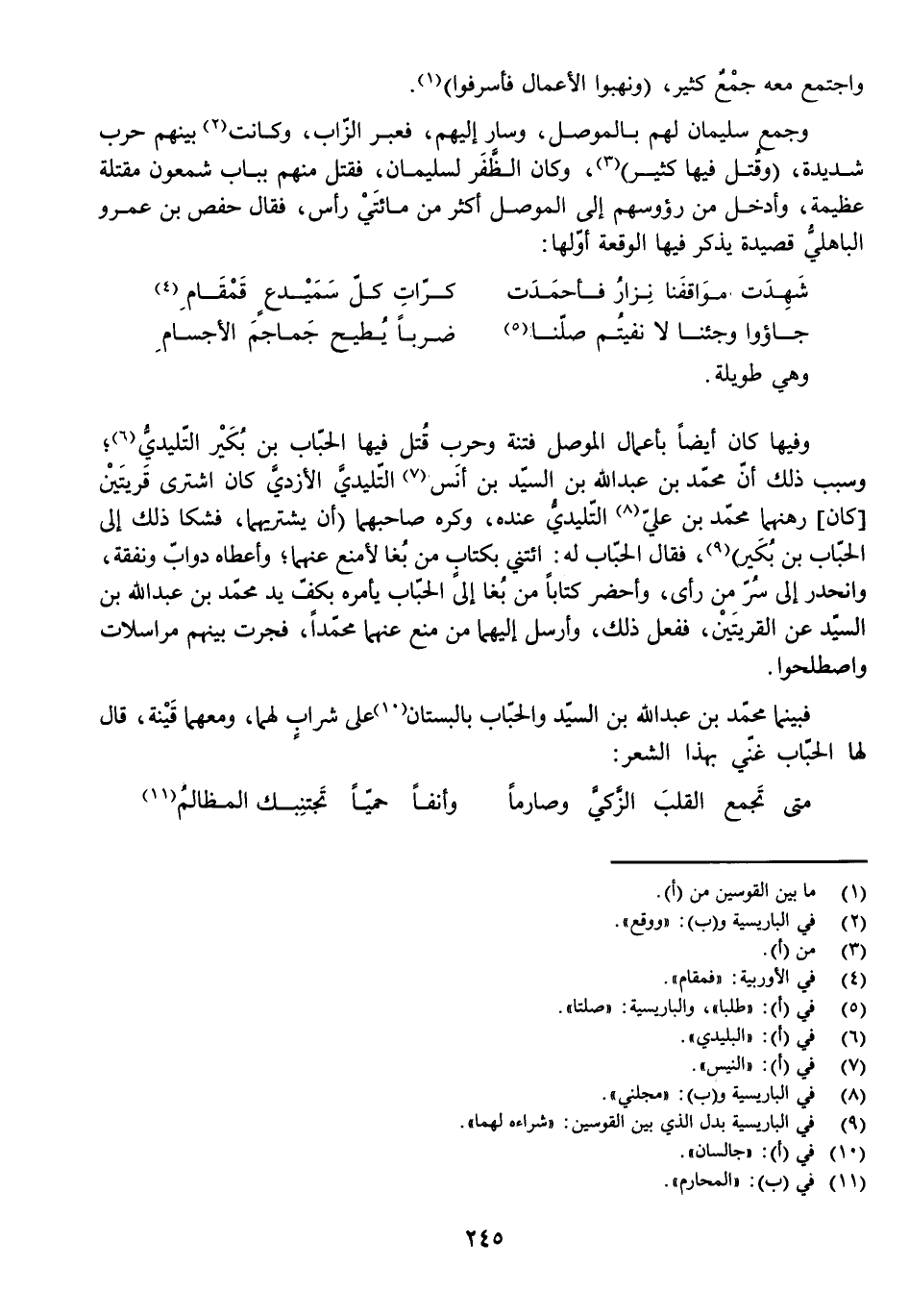 وَجَمَعَ سَلِيمَانُ لَهُمْ بِالْمَوْصِلِ، وَسَارَ إِلَيْهِمْ، فَعَبَرَ الزَّابَ، وَكَانَتْ بَيْنَهُمْ حَرْبٌ شَدِيدَةٌ، (وَقُتِلَ فِيهَا كَثِيرٌ) ، وَكَانَ الظَّفَرُ لِسُلَيْمَانَ، فَقَتَلَ مِنْهُمْ بِبَابِ شَمْعُونَ مَقْتَلَةً عَظِيمَةً، وَأَدْخَلَ مِنْ رُؤُوسِهِمْ إِلَى الْمَوْصِلِ أَكْثَرَ مِنْ مِائَتَيْ رَأْسٍ، فَقَالَ حَفْصُ بْنُ عَمْرٍو الْبَاهِلِيُّ قَصِيدَةً يَذْكُرُ فِيهَا الْوَقْعَةَ أَوَّلُهَا:
