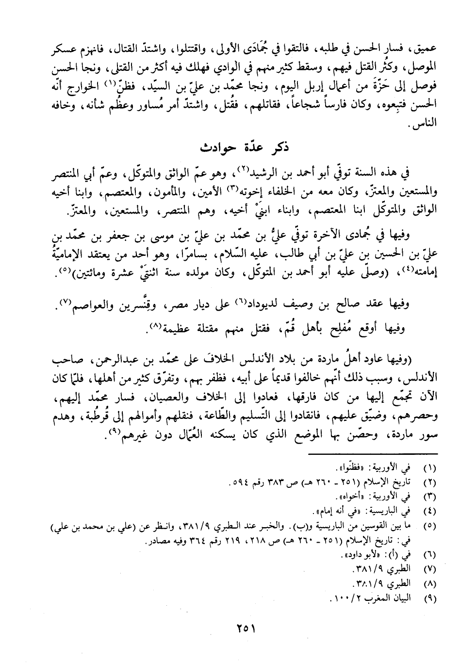(وَفِيهَا عَاوَدَ أَهْلُ مَارِدَةَ مِنْ بِلَادِ الْأَنْدَلُسِ الْخِلَافَ عَلَى مُحَمَّدِ بْنِ عَبْدِ الرَّحْمَنِ، صَاحِبِ الْأَنْدَلُسِ، وَسَبَبُ ذَلِكَ أَنَّهُمْ خَالَفُوا قَدِيمًا عَلَى أَبِيهِ، فَظَفِرَ بِهِمْ، وَتَفَرَّقَ كَثِيرٌ مِنْ أَهْلِهَا، فَلَمَّا كَانَ الْآنَ تَجَمَّعَ إِلَيْهَا مَنْ كَانَ فَارَقَهَا، فَعَادُوا إِلَى الْخِلَافِ وَالْعِصْيَانِ، فَسَارَ مُحَمَّدٌ إِلَيْهِمْ، وَحَصَرَهُمْ، وَضَيَّقَ عَلَيْهِمْ، فَانْقَادُوا إِلَى التَّسْلِيمِ وَالطَّاعَةِ، فَنَقَلَهُمْ وَأَمْوَالَهُمْ إِلَى قُرْطُبَةَ، وَهَدَمَ سُورَ مَارِدَةَ، وَحَصَّنَ بِهَا الْمَوْضِعَ الَّذِي كَانَ يَسْكُنُهُ الْعُمَّالُ دُونَ غَيْرِهِمْ.
