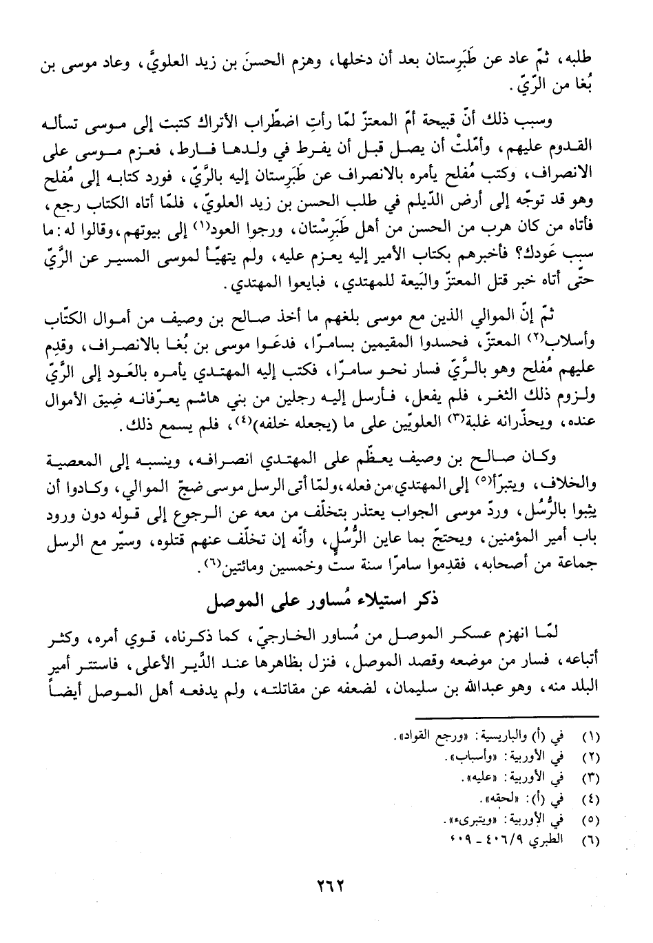 طَلَبِهِ، ثُمَّ عَادَ عَنْ طَبَرِسْتَانَ بَعْدَ أَنْ دَخَلَهَا، وَهَزَمَ الْحَسَنَ بْنَ زَيْدٍ الْعَلَوِيَّ، وَعَادَ مُوسَى بْنُ بُغَا مِنَ الرَّيِّ.