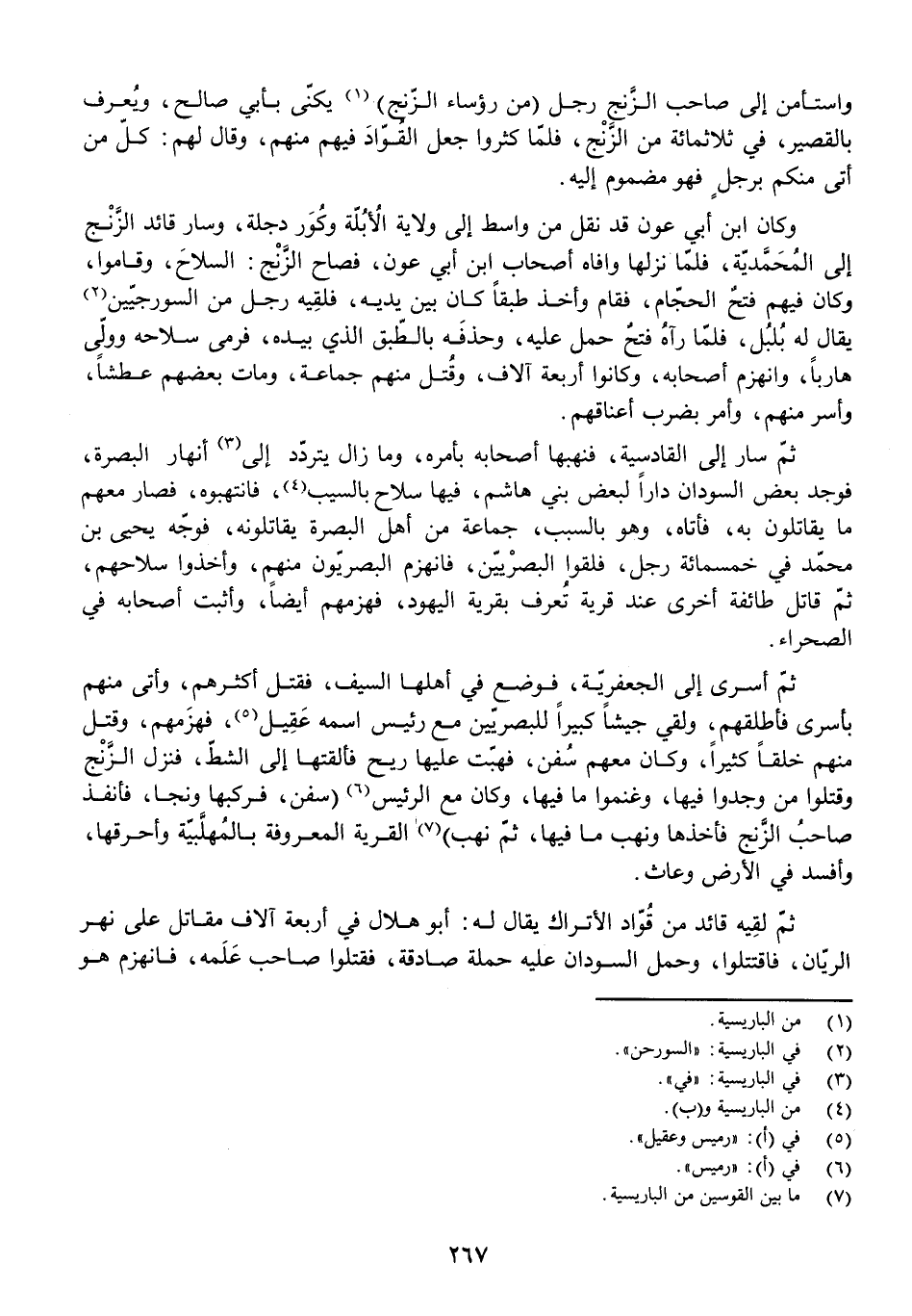 ثُمَّ سَارَ إِلَى الْقَادِسِيَّةِ، فَنَهَبَهَا أَصْحَابُهُ بِأَمْرِهِ، وَمَا زَالَ يَتَرَدَّدُ إِلَى أَنْهَارِ الْبَصْرَةِ، فَوَجَدَ بَعْضُ السُّودَانِ دَارًا لِبَعْضِ بَنِي هَاشِمٍ، فِيهَا سِلَاحٌ بِالسَّيْبِ، فَانْتَهَبُوهُ، فَصَارَ مَعَهُمْ مَا يُقَاتِلُونَ بِهِ، فَأَتَاهُ، وَهُوَ بِالسَّبَبِ، جَمَاعَةٌ مِنْ أَهْلِ الْبَصْرَةِ يُقَاتِلُونَهُ، فَوَجَّهَ يَحْيَى بْنَ مُحَمَّدٍ فِي خَمْسِمِائَةِ رَجُلٍ، فَلَقَوُا الْبَصْرِيِّينَ، فَانْهَزَمَ الْبَصْرِيُّونَ مِنْهُمْ، وَأَخَذُوا سِلَاحَهُمْ، ثُمَّ قَاتَلَ طَائِفَةً أُخْرَى عِنْدَ قَرْيَةٍ تُعْرَفُ بِقَرْيَةِ الْيَهُودِ، فَهَزَمَهُمْ أَيْضًا، وَأَثْبَتَ أَصْحَابَهُ فِي الصَّحْرَاءِ.