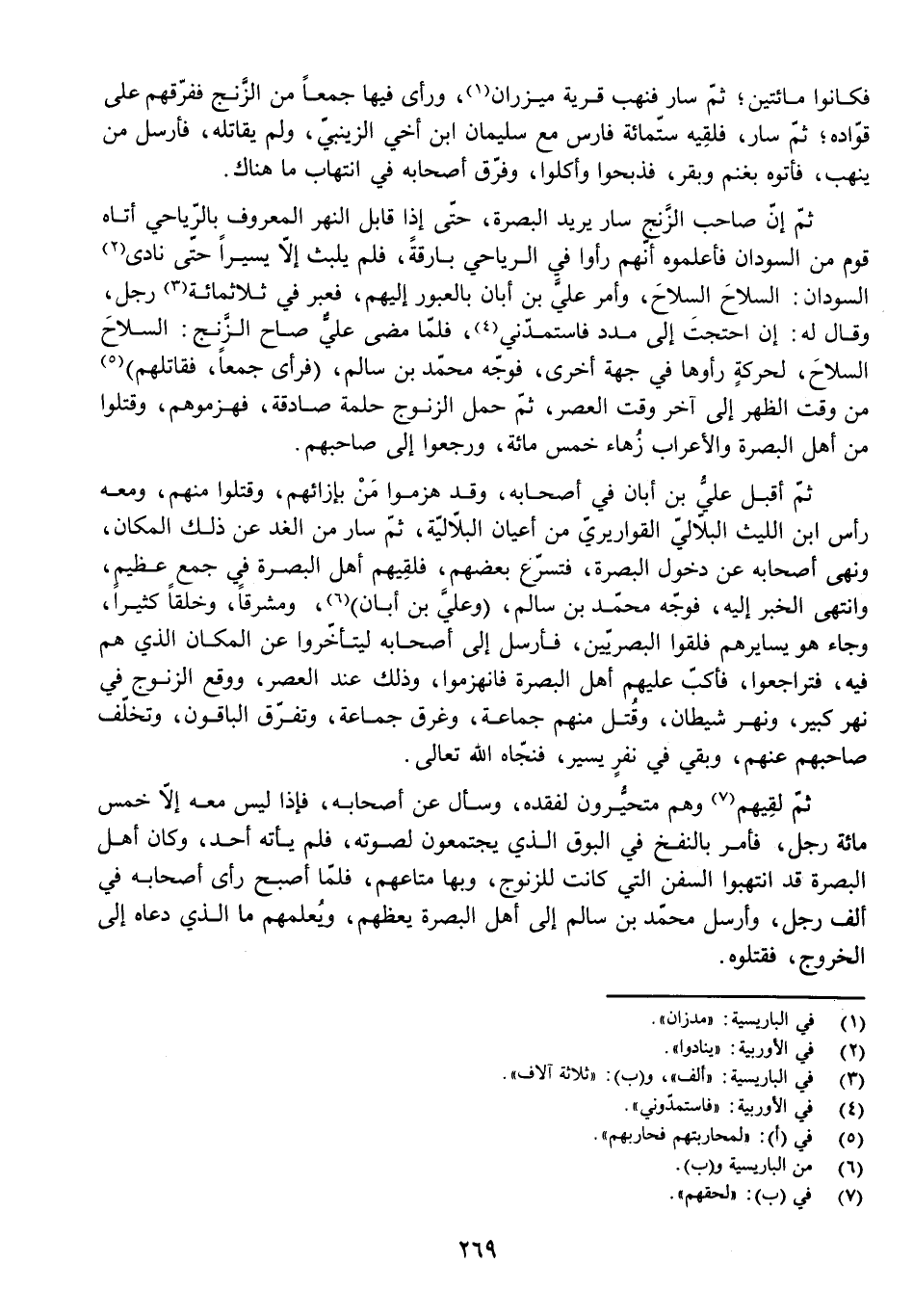 فَكَانُوا مِائَتَيْنِ، ثُمَّ سَارَ فَنَهَبَ قَرْيَةَ مَيْزَرَانَ، وَرَأَى فِيهَا جَمْعًا مِنَ الزَّنْجِ فَفَرَّقَهُمْ عَلَى قُوَّادِهِ ; ثُمَّ سَارَ، فَلَقِيَهُ سِتُّمِائَةِ فَارِسٍ مَعَ سُلَيْمَانَ ابْنِ أَخِي الزَّيْنَبِيِّ، وَلَمْ يُقَاتِلْهُ، فَأَرْسَلَ مَنْ يَنْهَبُ، فَأَتَوْهُ بِغَنَمٍ وَبَقَرٍ، فَذَبَحُوا وَأَكَلُوا، وَفَرَّقَ أَصْحَابَهُ فِي انْتِهَابِ مَا هُنَاكَ.