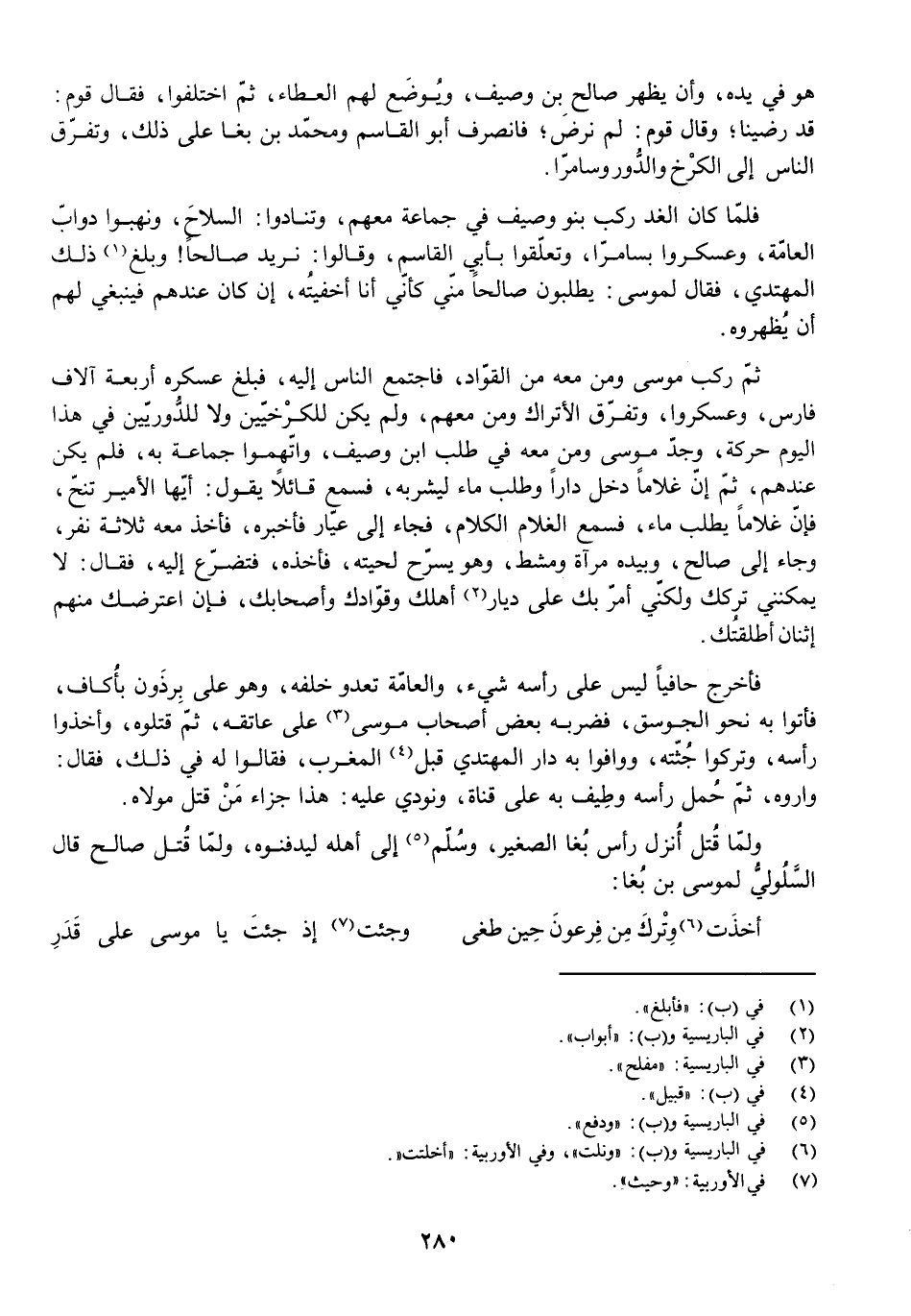 فَلَمَّا كَانَ الْغَدُ رَكِبَ بَنُو وَصِيفٍ فِي جَمَاعَةٍ مَعَهُمْ، وَتَنَادَوْا: السِّلَاحَ، وَنَهَبُوا دَوَابَّ الْعَامَّةِ، وَعَسْكَرُوا بِسَامَرَّا، وَتَعَلَّقُوا بِأَبِي الْقَاسِمِ، وَقَالُوا: نُرِيدُ صَالِحًا! وَبَلَغَ ذَلِكَ الْمُهْتَدِيَ، فَقَالَ لِمُوسَى: يَطْلُبُونَ صَالِحًا مِنِّي كَأَنِّي أَنَا أَخْفَيْتُهُ، إِنْ كَانَ عِنْدَهُمْ فَيَنْبَغِي لَهُمْ أَنْ يُظْهِرُوهُ.