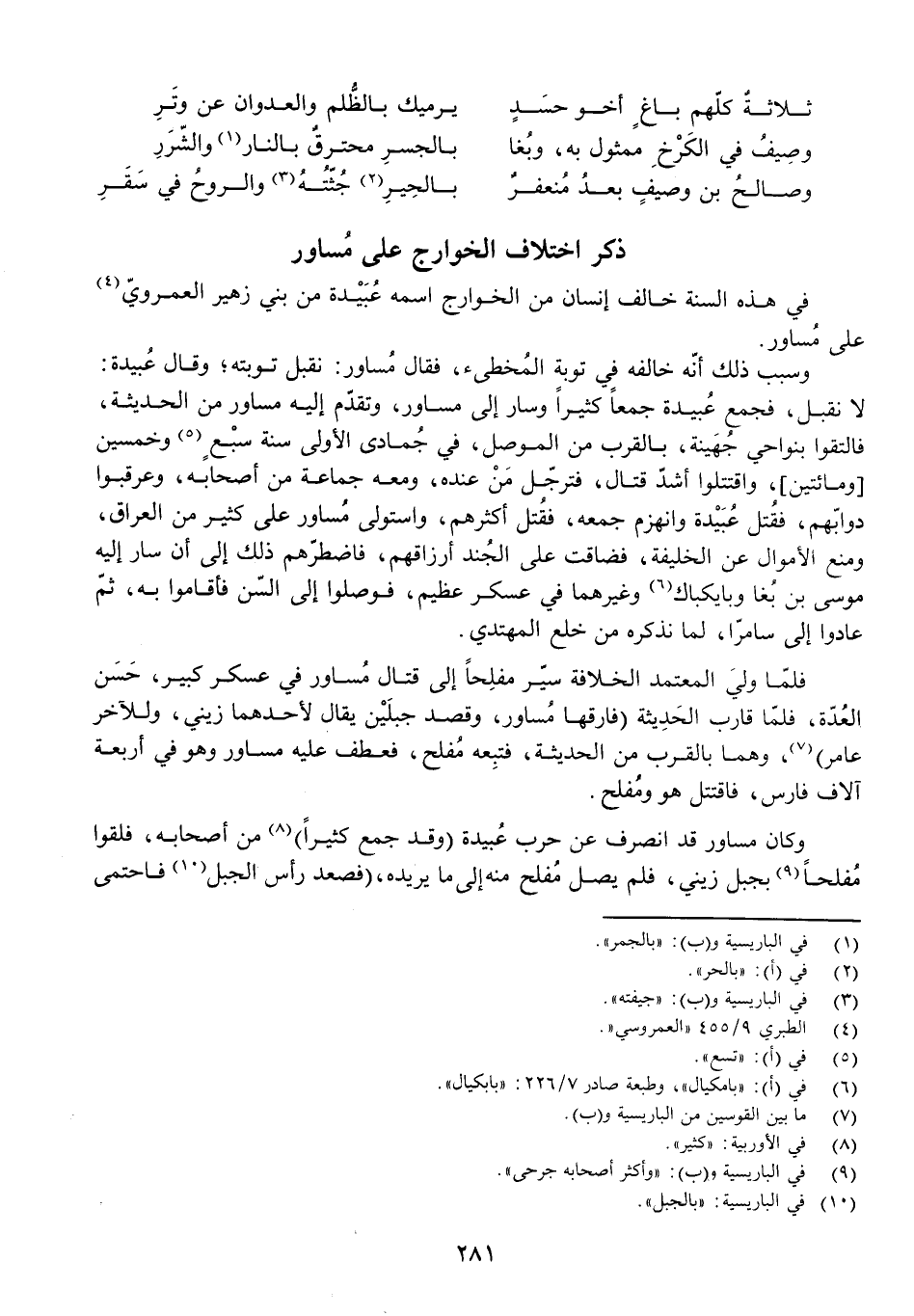 ذِكْرُ اخْتِلَافِ الْخَوَارِجِ عَلَى مُسَاوِرٍ
