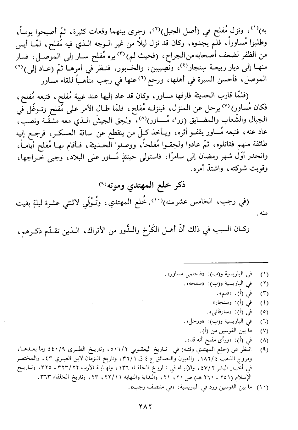 بِهِ) ، وَنَزَلَ مُفْلِحٌ فِي (أَصْلِ الْجَبَلِ) ، وَجَرَى بَيْنَهُمَا وَقَعَاتٌ كَثِيرَةٌ، ثُمَّ أَصْبَحُوا يَوْمًا، وَطَلَبُوا مُسَاوِرًا، فَلَمْ يَجِدُوهُ، وَكَانَ قَدْ نَزَلَ لَيْلًا مِنْ غَيْرِ الْوَجْهِ الَّذِي فِيهِ مُفْلِحٌ، لَمَّا أَيِسَ مِنَ الظَّفَرِ لِضَعْفِ أَصْحَابِهِ مِنَ الْجِرَاحِ، (فَحَيْثُ لَمْ) يَرَهُ مُفْلِحٌ سَارَ إِلَى الْمَوْصِلِ، فَسَارَ إِلَى الْمَوْصِلِ، فَسَارَ مِنْهَا إِلَى دِيَارِ رَبِيعَةِ سِنْجَارٍ، وَنَصِيبِينَ، وَالْخَابُورِ، فَنَظَرَ فِي أَمْرِهَا، ثُمَّ (عَادَ إِلَى) الْمَوْصِلِ، فَأَحْسَنَ السِّيرَةَ فِي أَهْلِهَا، وَرَجَعَ عَنْهَا فِي رَجَبٍ مُتَأَهِّبًا لِلِقَاءِ مُسَاوِرٍ.