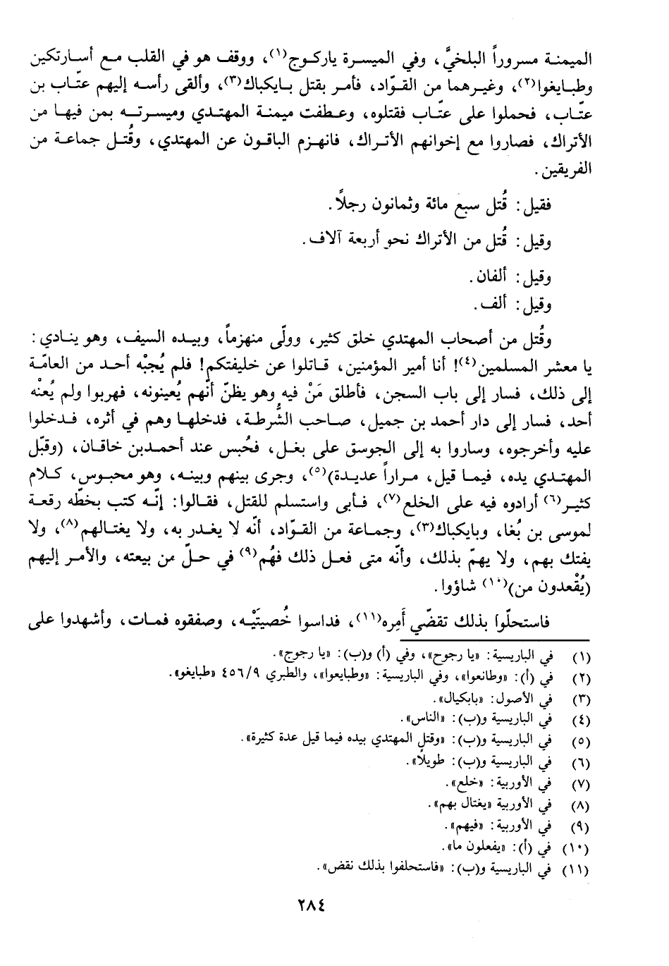 فَقِيلَ: قُتِلَ سَبْعُمِائَةٍ وَثَمَانُونَ رَجُلًا، وَقِيلَ: قُتِلَ مِنَ الْأَتْرَاكِ نَحْوُ أَرْبَعَةِ آلَافٍ.