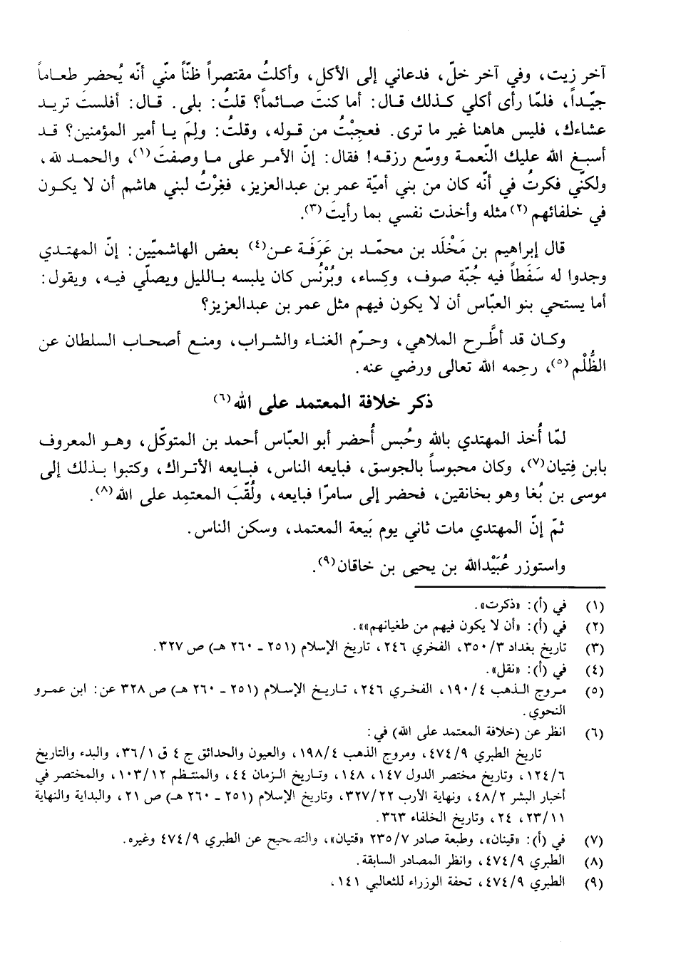 فَعَجِبْتُ مِنْ قَوْلِهِ، وَقُلْتُ: وَلِمَ يَا أَمِيرَ الْمُؤْمِنِينَ؟ قَدْ أَسْبَغَ اللَّهُ عَلَيْكَ النِّعْمَةَ وَوَسَّعَ رِزْقَهُ! فَقَالَ: إِنَّ الْأَمْرَ عَلَى مَا وَصَفْتُ، وَالْحَمْدُ لِلَّهِ، وَلَكِنِّي فَكَّرْتُ فِي أَنَّهُ كَانَ مِنْ بَنِي أُمَيَّةَ عُمَرُ بْنُ عَبْدِ الْعَزِيزِ، فَغِرْتُ لِبَنِي هَاشِمٍ أَنْ لَا يَكُونَ فِي خُلَفَائِهِمْ مِثْلُهُ وَأَخَذْتُ نَفْسِي بِمَا رَأَيْتَ.