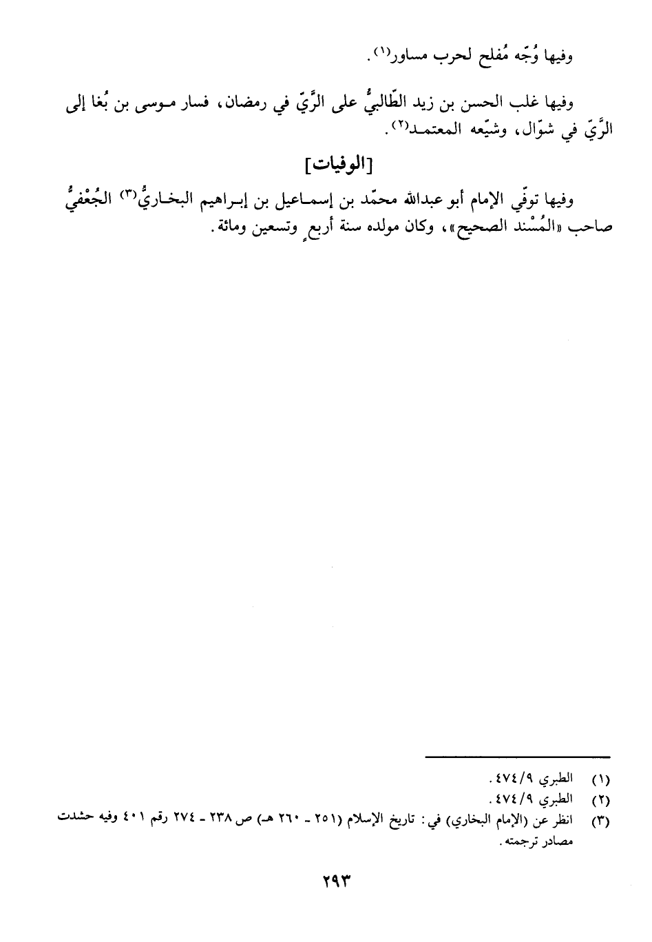 وَفِيهَا تُوُفِّيَ الْإِمَامُ أَبُو عَبْدِ اللَّهِ مُحَمَّدُ بْنُ إِسْمَاعِيلَ بْنِ إِبْرَاهِيمَ الْبُخَارِيُّ الْجُعْفِيُّ صَاحِبُ الْمُسْنَدِ الصَّحِيحِ، وَكَانَ مَوْلِدُهُ سَنَةَ أَرْبَعٍ وَتِسْعِينَ وَمِائَةٍ.