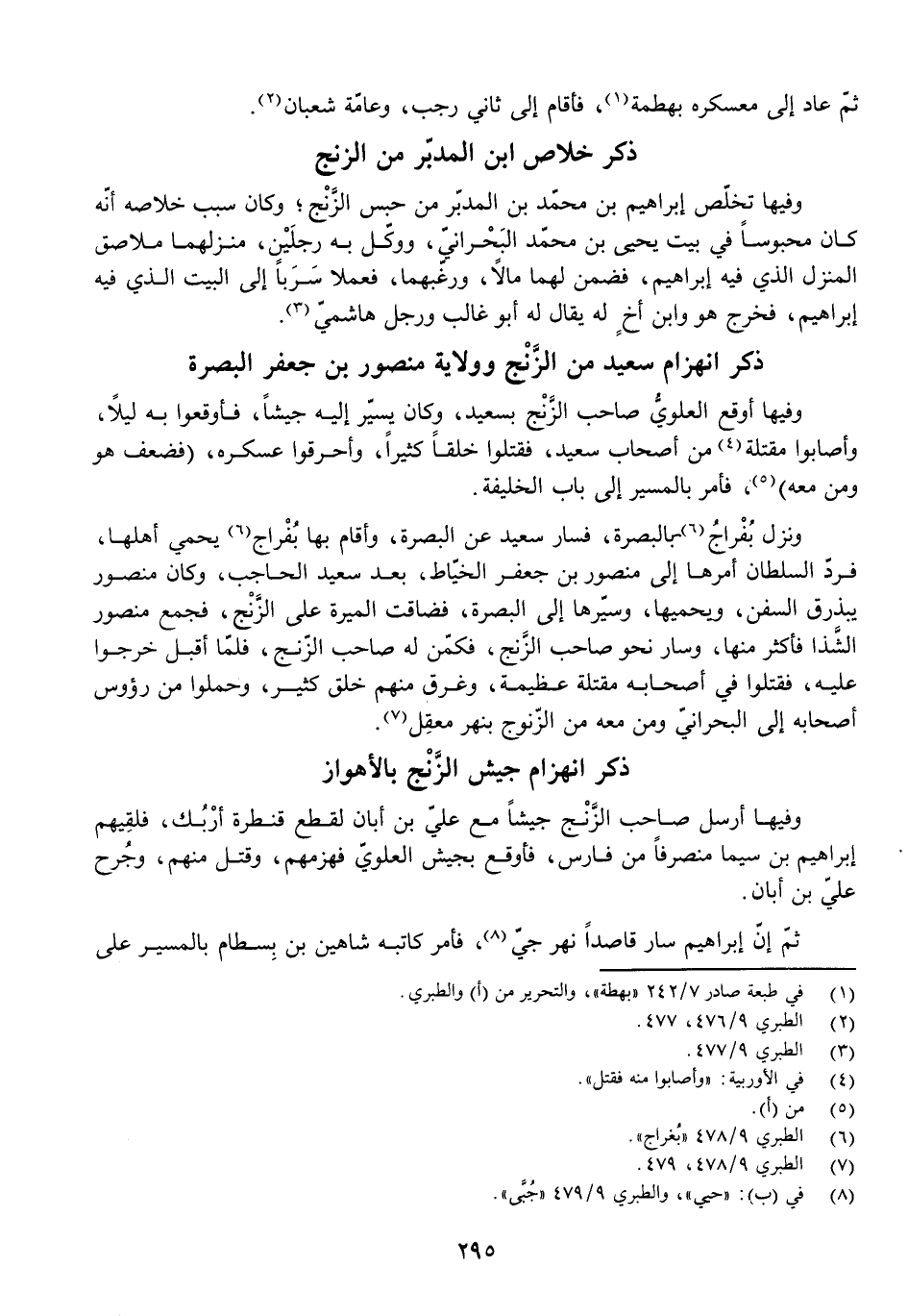 وَنَزَلَ بُفْرَاجُ بِالْبَصْرَةِ، فَسَارَ سَعِيدٌ عَنِ الْبَصْرَةِ، وَأَقَامَ بِهَا بُفْرَاجُ يَحْمِي أَهْلَهَا، فَرَدَّ السُّلْطَانُ أَمْرَهَا إِلَى مَنْصُورِ بْنِ جَعْفَرٍ الْخَيَّاطِ، بَعْدَ سَعِيدٍ الْحَاجِبِ، وَكَانَ مَنْصُورٌ يُبَذْرِقُ السُّفُنَ، وَيَحْمِيَهَا، وَسَيَّرَهَا إِلَى الْبَصْرَةِ، فَضَاقَتِ الْمِيرَةُ عَلَى الزَّنْجِ، فَجَمَعَ مَنْصُورٌ الشَّذَا فَأَكْثَرَ مِنْهَا، وَسَارَ نَحْوَ صَاحِبِ الزَّنْجِ، فَكَمَنَ لَهُ صَاحِبُ الزَّنْجِ، فَلَمَّا أَقْبَلْ خَرَجُوا عَلَيْهِ، فَقَتَلُوا فِي أَصْحَابِهِ مَقْتَلَهً عَظِيمَةً، وَغَرِقَ مِنْهُمْ خَلْقٌ كَثِيرٌ، وَحَمَلُوا مِنْ رُءُوسِ أَصْحَابِهِ إِلَى الْبَحْرَانِيِّ وَمَنْ مَعَهُ مِنَ الزُّنُوجِ بِنَهْرِ مَعْقِلٍ.