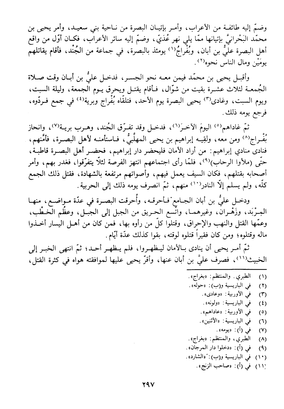 وَأَقْبَلَ يَحْيَى بْنُ مُحَمَّدٍ فِيمَنْ مَعَهُ نَحْوَ الْجِسْرِ، فَدَخَلَ عَلِيُّ بْنُ أَبَانٍ وَقْتَ صَلَاةِ الْجُمُعَةَ لِثَلَاثَ عَشْرَةَ بَقِيَتْ مِنْ شَوَّالٍ، فَأَقَامَ يَقْتُلُ وَيَحْرِقُ يَوْمَ الْجُمُعَةِ، وَلَيْلَةَ السَّبْتِ، وَيَوْمَ السَّبْتِ، وَغَادَى يَحْيَى الْبَصْرَةَ يَوْمَ الْأَحَدِ، فَتَلَقَّاهُ بُفْرَاجُ وَبَرِّيَّةُ فِي جَمْعٍ فَرَدُّوهُ، فَرَجَعَ يَوْمَهُ ذَلِكَ.