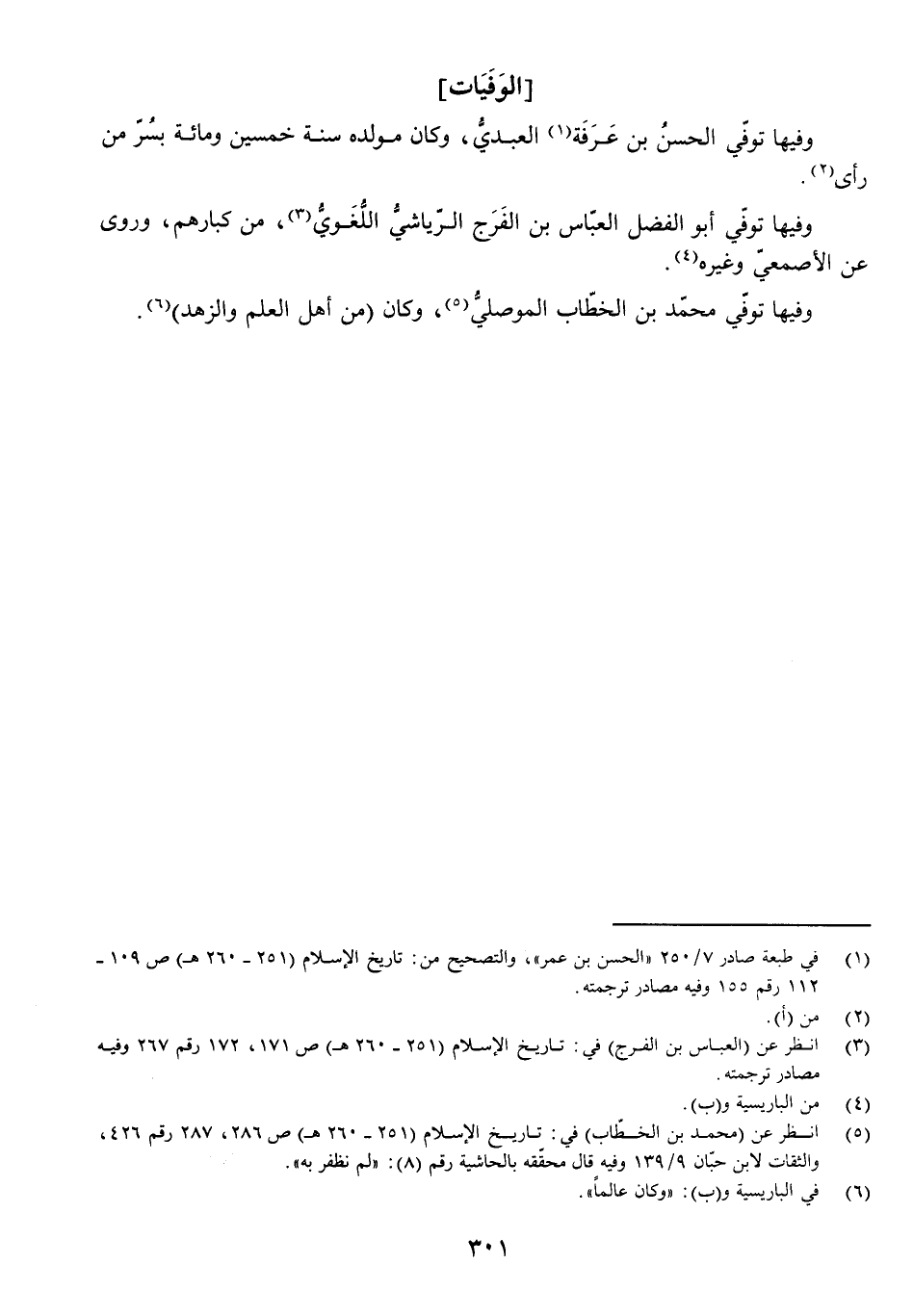 وَفِيهَا تُوُفِّيَ الْحَسَنُ بْنُ عَرَفَةَ الْعَبْدِيُّ، وَكَانَ مَوْلِدُهُ سَنَةَ خَمْسِينَ وَمِائَةٍ بِسُرَّ مَنْ رَأَى.