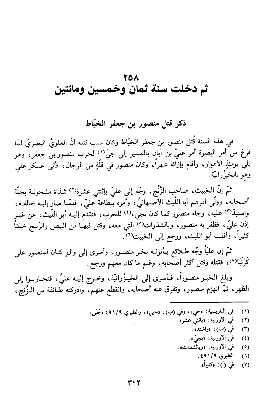 فِي هَذِهِ السَّنَةِ قُتِلَ مَنْصُورُ بْنُ جَعْفَرٍ الْخَيَّاطُ، وَكَانَ سَبَبُ قَتْلِهِ أَنَّ الْعَلَوِيَّ الْبَصْرِيَّ لَمَّا فَرَغَ مِنْ أَمْرِ الْبَصْرَةِ أَمَّرَ عَلِيَّ بْنَ أَبَانٍ بِالْمَسِيرِ إِلَى جَيٍّ لِحَرْبِ مَنْصُورِ بْنِ جَعْفَرٍ، وَهُوَ يَلِي يَوْمَئِذٍ الْأَهْوَازَ، وَأَقَامَ بِإِزَائِهِ شَهْرًا، وَكَانَ مَنْصُورٌ فِي قِلَّةٍ مِنَ الرِّجَالِ، فَأَتَى عَسْكَرَ عَلِيٍّ وَهُوَ بِالْخَيْزُرَانِيَّةِ.