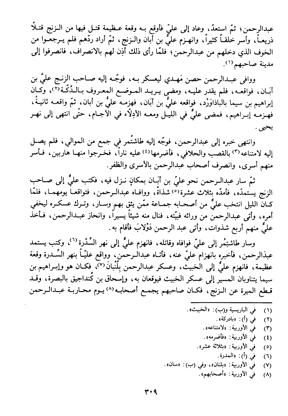 عَبْدُ الرَّحْمَنِ، ثُمَّ اسْتَعَدَّ، وَعَادَ إِلَى عَلَيٍّ، فَأَوْقَعَ بِهِ وَقْعَةً عَظِيمَةً قَتَلَ فِيهَا مِنَ الزَّنْجِ قَتْلًا ذَرِيعًا، وَأَسَرَ خَلْقًا كَثِيرًا، وَانْهَزَمَ عَلِيُّ بْنُ أَبَانٍ، وَالزَّنْجُ، ثُمَّ أَرَادَ رَدَّهُمْ فَلَمْ يَرْجِعُوا مِنَ الْخَوْفِ الَّذِي دَخَلَهُمْ مِنْ عَبْدِ الرَّحْمَنِ ; فَلَمَّا رَأَى ذَلِكَ أَذِنَ لَهُمْ بِالِانْصِرَافِ، فَانْصَرَفُوا إِلَى مَدِينَةِ صَاحِبِهِمْ.