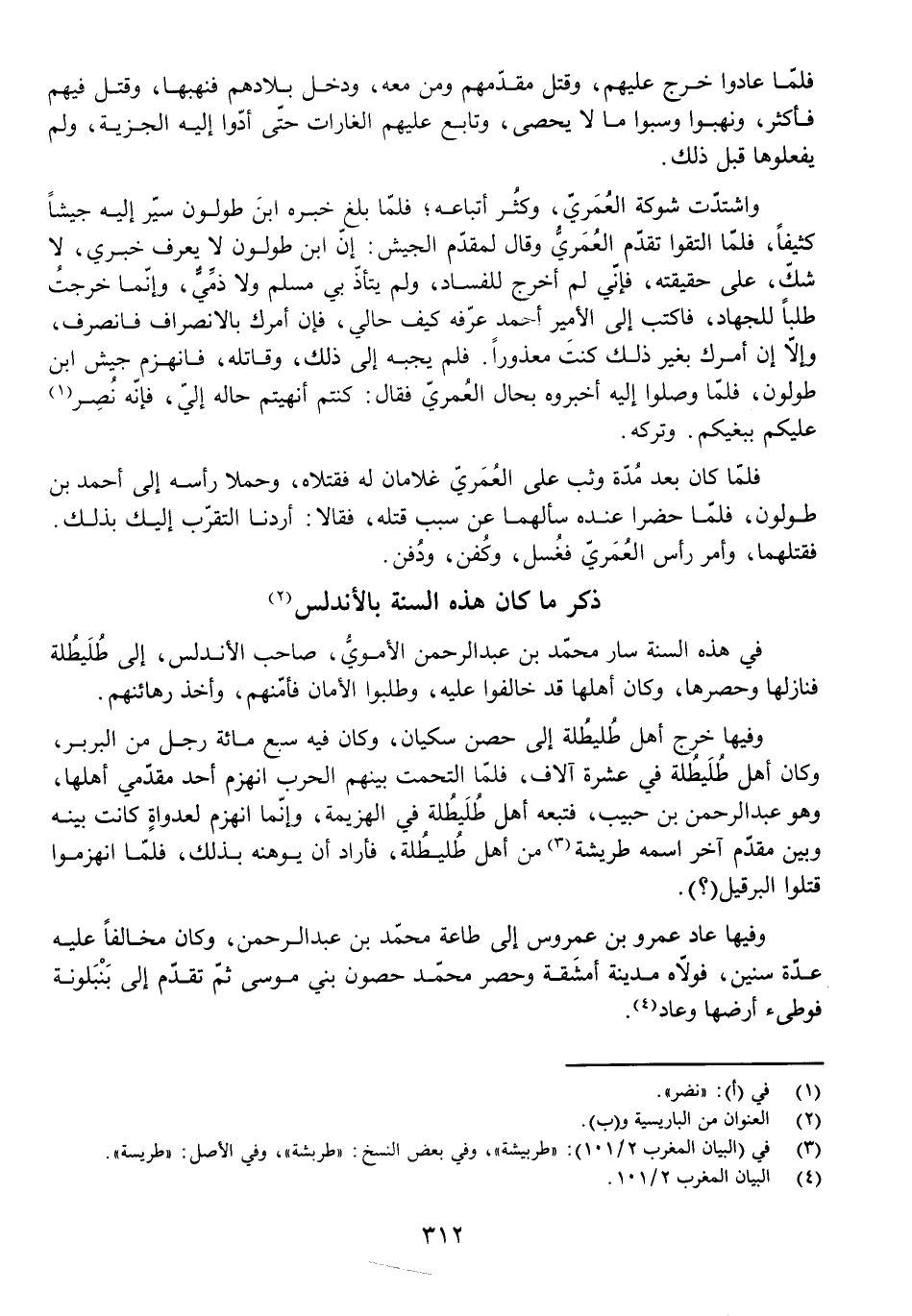 وَفِيهَا خَرَجَ أَهْلُ طُلَيْطُلَةَ إِلَى حِصْنِ سَكْيَانَ، وَكَانَ فِيهِ سَبْعُمِائَةَ رَجُلٍ مِنَ الْبَرْبَرِ، وَكَانَ أَهْلُ طُلَيْطُلَةَ فِي عَشَرَةِ آلَافٍ، فَلَمَّا الْتَحَمَتِ الْحَرْبُ بَيْنَهُمُ انْهَزَمَ أَحَدُ مُقَدَّمِي أَهْلِهَا، وَهُوَ عَبْدُ الرَّحْمَنِ بْنُ حَبِيبٍ، فَتَبِعَهُ أَهْلُ طُلَيْطُلَةَ فِي الْهَزِيمَةِ، وَإِنَّمَا انْهَزَمَ لِعَدَاوَةٍ كَانَتْ بَيْنَهُ وَبَيْنَ مُقَدَّمٍ آخَرَ اسْمُهُ طُرَيْشَةُ مِنْ أَهْلِ طُلَيْطُلَةَ، فَأَرَادَ أَنْ يُوهِنَهُ فِي ذَلِكَ، فَلَمَّا انْهَزَمُوا قَتَلُوا الْبِرْقِيلَ (؟) .
