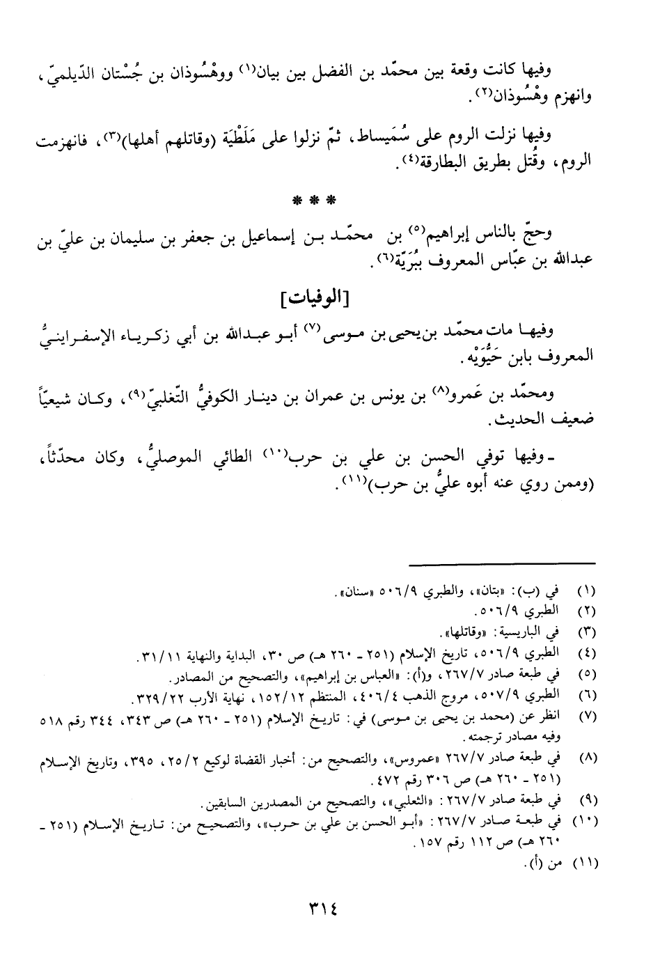 وَفِيهَا نَزَلَتِ الرُّومُ عَلَى سُمَيْسَاطَ، ثُمَّ نَزَلُوا عَلَى مَلْطِيَّةَ، (وَقَاتَلَهُمْ أَهْلُهَا) ، فَانْهَزَمَتِ الرُّومُ، وَقُتِلَ بِطْرِيقُ الْبَطَارِقَةِ.