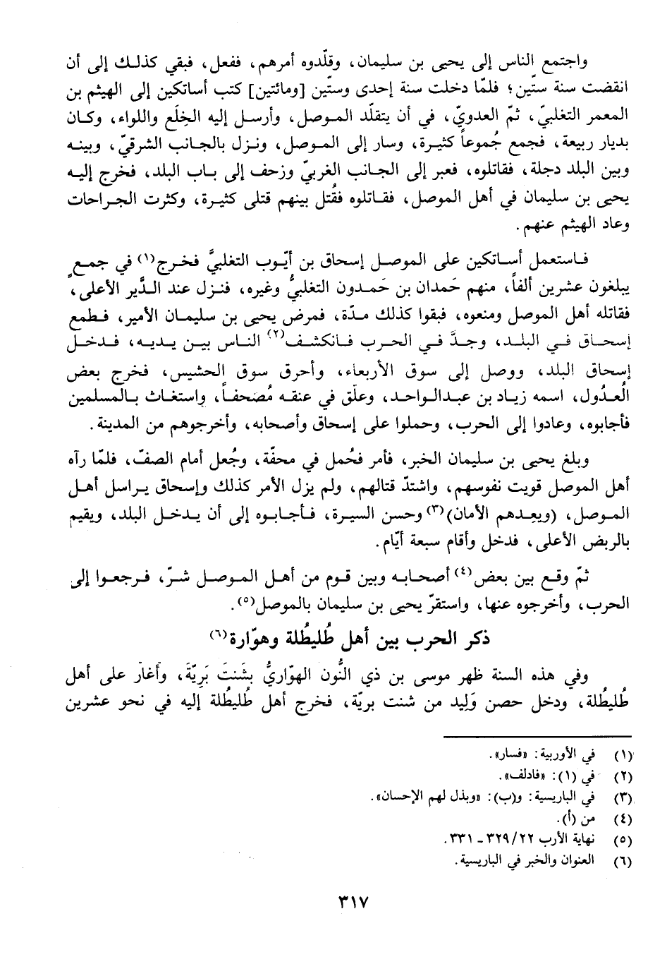 ثُمَّ وَقَعَ بَيْنَ بَعْضِ أَصْحَابِهِ، وَبَيْنَ قَوْمٍ مِنْ أَهْلِ الْمَوْصِلِ شَرٌّ، فَرَجَعُوا إِلَى الْحَرْبِ، وَأَخْرَجُوهُ عَنْهَا، وَاسْتَقَرَّ يَحْيَى بْنُ سُلَيْمَانَ بِالْمَوْصِلِ.