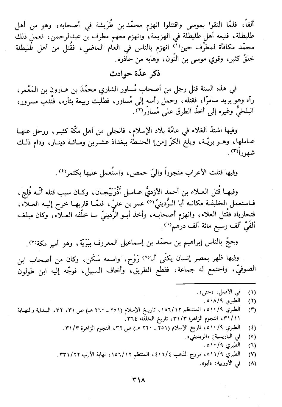 فِي هَذِهِ السَّنَةِ قَتَلَ رَجُلٌ مِنْ أَصْحَابِ مُسَاوِرٍ الشَّارِيِّ مُحَمَّدَ بْنَ هَارُونَ بْنِ الْمُعَمِّرِ، رَآهُ وَهُوَ يُرِيدُ سَامَرَّا، فَقَتَلَهُ، وَحَمَلَ رَأْسَهُ إِلَى مُسَاوِرٍ، فَطَلَبَتْ رَبِيعَةُ بِثَأْرِهِ، فَنُدِبَ مَسْرُورٌ الْبَلْخِيُّ، وَغَيْرُهُ إِلَى أَخْذِ الطُّرُقِ عَلَى مُسَاوِرٍ.
