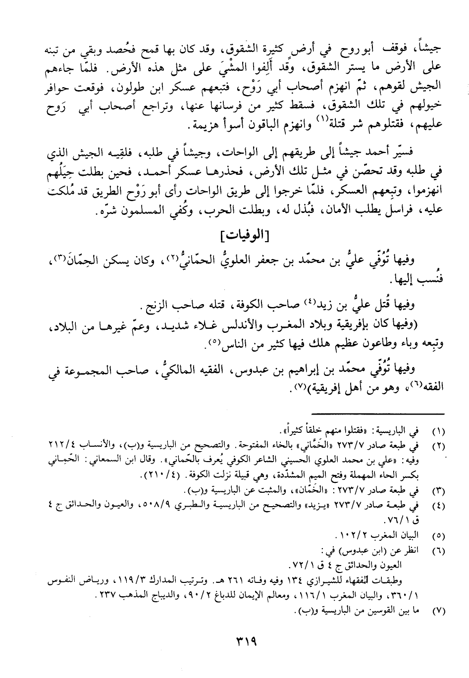 وَفِيهَا تُوُفِّيَ مُحَمَّدُ بْنُ إِبْرَاهِيمَ بْنِ عَبْدُوسَ الْفَقِيهُ الْمَالِكِيُّ صَاحِبُ الْمَجْمُوعَةِ فِي الْفِقْهِ، وَهُوَ مِنْ أَهْلِ إِفْرِيقِيَّةَ) .
