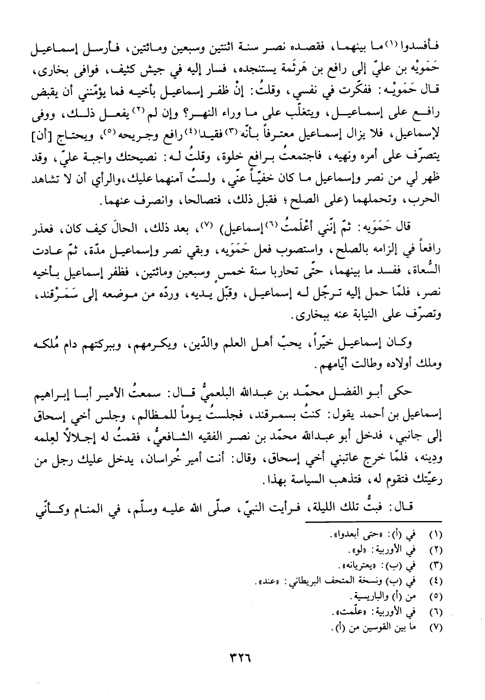 قَالَ حَمَّوَيْهِ: ثُمَّ إِنَّنِي أَعْلَمْتُ إِسْمَاعِيلَ) ، بَعْدَ ذَلِكَ الْحَالِ كَيْفَ كَانَ، فَعَذَرَ رَافِعًا فِي إِلْزَامِهِ بِالصُّلْحِ، وَاسْتَصْوَبَ فِعْلَ حَمَّوَيْهِ، بَقِيَ نَصْرٌ وَإِسْمَاعِيلُ مُدَّةً، ثُمَّ عَادَتِ السُّعَاةُ، فَفَسَدَ مَا بَيْنَهُمَا، حَتَّى تَحَارَبَا سَنَةَ خَمْسٍ وَسَبْعِينَ وَمِائَتَيْنِ، فَظَهَرَ إِسْمَاعِيلُ بِأَخِيهِ نَصْرٍ، فَلَمَّا حَمَلَ إِلَيْهِ تَرَجَّلَ لَهُ إِسْمَاعِيلُ، وَقَبَّلَ يَدَيْهِ، وَرَدَّهُ مِنْ مَوْضِعِهِ إِلَى سَمَرْقَنْدَ، وَتَصَرَّفَ عَلَى النِّيَابَةِ عَنْهُ بِبُخَارَى.