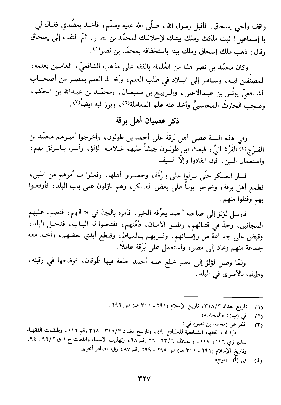 وَفِي هَذِهِ السَّنَةِ عَصَى أَهْلُ بُرْقَةَ عَلَى أَحْمَدَ بْنِ طُولُونَ، وَأَخْرَجُوا أَمِيرَهُمْ مُحَمَّدَ بْنَ الْفَرَجِ الْفَرْغَانِيَّ، فَبَعَثَ ابْنُ طُولُونَ جَيْشًا عَلَيْهِمْ غُلَامُهُ لُؤْلُؤٌ، وَأَمَرَهُ بِالرِّفْقِ بِهِمْ، وَاسْتِعْمَالِ اللِّينَ، فَإِنِ انْقَادُوا وَإِلَّا السَّيْفُ.