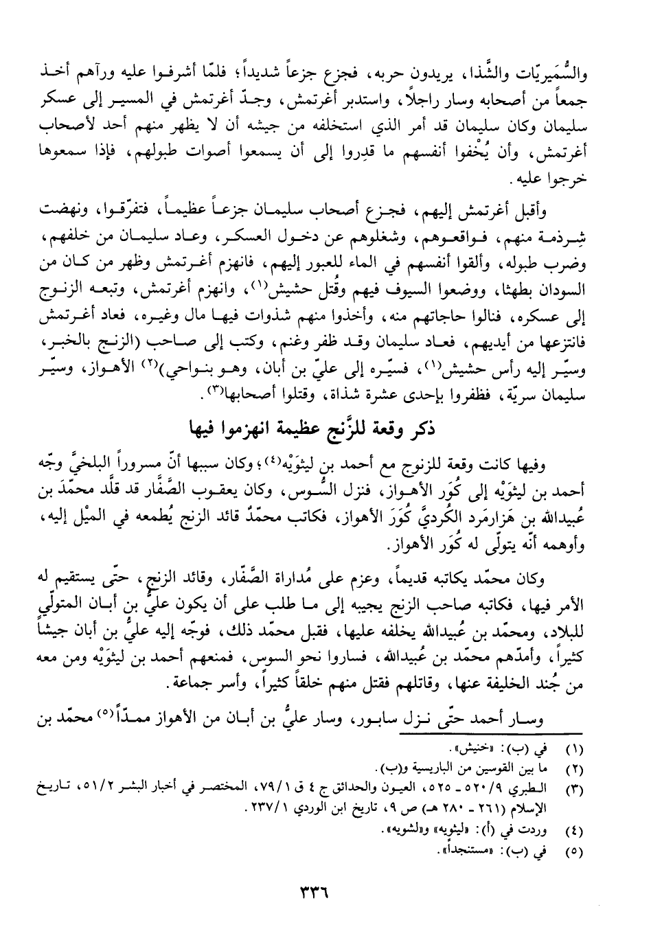 وَأَقْبَلَ أَغْرَتْمِشُ إِلَيْهِمْ، فَجَزِعَ أَصْحَابُ سُلَيْمَانَ جَزَعًا عَظِيمًا، فَتَفَرَّقُوا، وَنَهَضَتْ شِرْذِمَةٌ مِنْهُمْ، فَوَاقَعُوهُمْ، وَشَغَلُوهُمْ عَنْ دُخُولِ الْعَسْكَرِ، وَعَادَ سُلَيْمَانُ مِنْ خَلْفِهِمْ، وَضَرَبَ طُبُولَهُ، وَأَلْقَوْا أَنْفُسَهُمْ فِي الْمَاءِ لِلْعُبُورِ إِلَيْهِمْ، فَانْهَزَمَ أَغْرَتْمِشَ وَظَهَرَ مَنْ كَانَ مِنَ السُّودَانِ بِطَهْثَا، وَوَضَعُوا السُّيُوفَ فِيهِمْ، وَقُتِلَ حَشِيشٌ، وَانْهَزَمَ أَغْرَتْمِشَ، وَتَبِعَهُ الزُّنُوجُ إِلَى عَسْكَرِهِ، فَنَالُوا حَاجَاتِهِمْ مِنْهُ، وَأَخَذُوا مِنْهُمْ شَذَوَاتٍ فِيهَا مَالٌ، وَغَيْرُهُ، فَعَادَ أَغْرَتْمِشَ فَانْتَزَعَهَا مِنْ أَيْدِيهِمْ، فَعَادَ سُلَيْمَانُ وَقَدْ ظَفِرَ وَغَنِمَ، وَكَتَبَ إِلَى صَاحِبِ (الزَّنْجِ بِالْخَبَرِ، وَسَيَّرَ إِلَيْهِ رَأْسَ حَشِيشٍ، فَسَيَّرَهُ إِلَى عَلِيِّ بْنِ أَبَانٍ، وَهُوَ بِنَوَاحِي) الْأَهْوَازِ، وَسَيَّرَ سُلَيْمَانُ سَرِيَّةً، فَظَفِرُوا بِإِحْدَى عَشْرَةَ شَذَاةً، وَقَتَلُوا أَصْحَابَهَا.