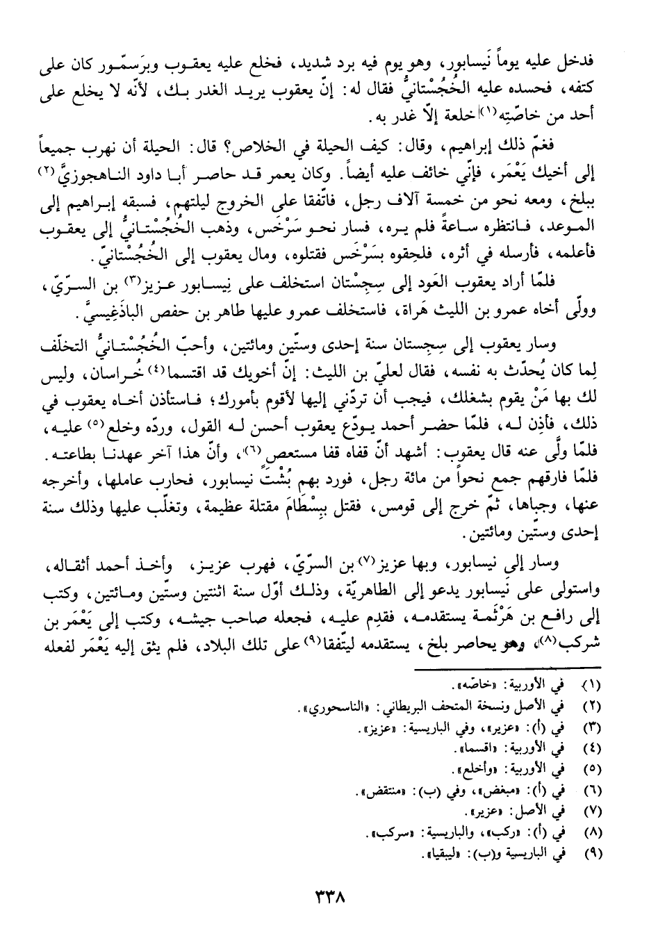 فَلَمَّا أَرَادَ يَعْقُوبُ الْعَوْدَ إِلَى سِجِسْتَانَ اسْتَخْلَفَ عَلَى نَيْسَابُورَ عَزِيزَ بْنَ السَّرِيِّ، وَوَلَّى أَخَاهُ عَمْرَو بْنَ اللَّيْثِ هَرَاةَ، فَاسْتَخْلَفَ عَمْرٌو عَلَيْهَا طَاهِرَ بْنَ حَفْصٍ الْبَاذَغِيسِيَّ.