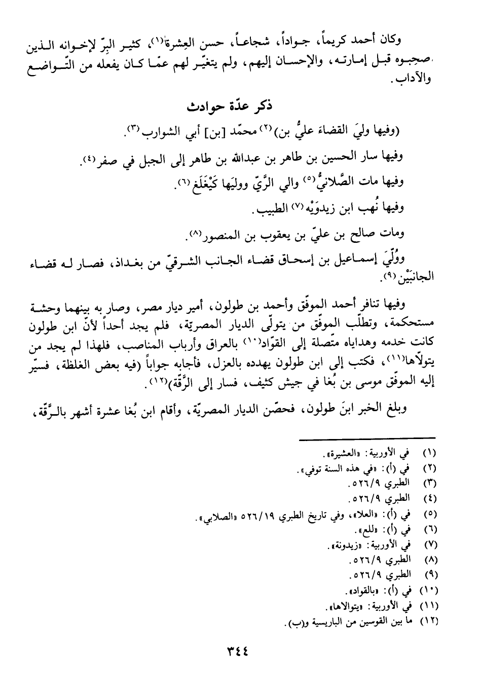 وَفِيهَا تَنَافَرَ أَبُو أَحْمَدَ الْمُوَفَّقُ، وَأَحْمَدُ بْنُ طُولُونَ أَمِيرُ دِيَارِ مِصْرَ، وَصَارَ بِهِ بَيْنَهُمَا وَحْشَةٌ مُسْتَحْكِمَةٌ، وَتَطَلَّبَ الْمُوَفَّقُ مَنْ يَتَوَلَّى الدِّيَارَ الْمِصْرِيَّةَ، فَلَمْ يَجِدْ أَحَدًا ; لِأَنَّ ابْنَ طُولُونَ كَانَتْ خَدَمُهُ وَهَدَايَاهُ مُتَّصِلَةٌ إِلَى الْقُوَّادِ بِالْعِرَاقِ، وَأَرْبَابِ الْمَنَاصِبِ، فَلَمْ يَجِدْ مَنْ يَتَوَلَّاهَا، فَكَتَبَ إِلَى ابْنِ طُولُونَ يُهَدِّدُهُ بِالْعَزْلِ، فَأَجَابَهُ جَوَابًا (فِيهِ بَعْضُ الْغِلْظَةِ، فَسَيَّرَ إِلَيْهِ الْمُوَفَّقُ مُوسَى بْنَ بُغَا فِي جَيْشٍ كَثِيفٍ، فَسَارَ إِلَى الرَّقَّةِ) .