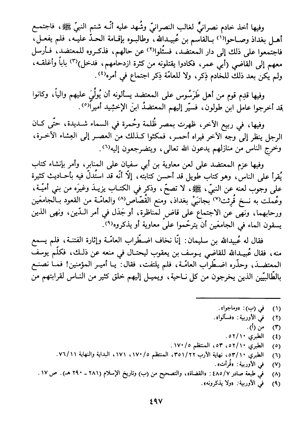 وَفِيهَا أُخِذَ خَادِمٌ نَصْرَانِيٌّ لِغَالِبٍ النَّصْرَانِيِّ وَشُهِدَ عَلَيْهِ أَنَّهُ شَتَمَ النَّبِيَّ صَلَّى اللَّهُ عَلَيْهِ وَسَلَّمَ، فَاجْتَمَعَ أَهْلُ بَغْدَاذَ وَصَاحُوا بِالْقَاسِمِ بْنِ عُبَيْدِ اللَّهِ، وَطَالَبُوهُ بِإِقَامَةِ الْحَدِّ عَلَيْهِ، فَلَمْ يَفْعَلْ، فَاجْتَمَعُوا عَلَى ذَلِكَ إِلَى دَارِ الْمُعْتَضِدِ، فَسُئِلُوا عَنْ حَالِهِمْ، فَذَكَرُوهُ لِلْمُعْتَضِدِ، فَأَرْسَلَ مَعَهُمْ إِلَى الْقَاضِي (أَبِي عُمَرَ، فَكَادُوا يَقْتُلُونَهُ مِنْ كَثْرَةِ ازْدِحَامِهِمْ، فَدَخَلَ) بَابًا، وَأَغْلَقَهُ، وَلَمْ يَكُنْ بَعْدَ ذَلِكَ لِلْخَادِمِ ذِكْرٌ، وَلَا لِلْعَامَّةِ ذِكْرُ اجْتِمَاعٍ فِي أَمْرِهِ.