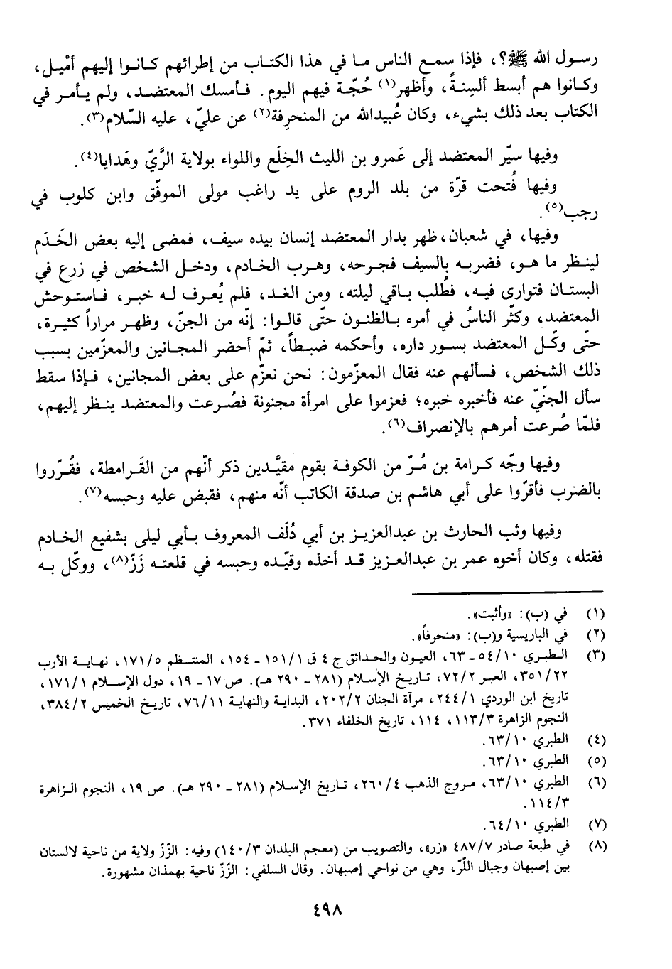 رَسُولِ اللَّهِ، صَلَّى اللَّهُ عَلَيْهِ وَسَلَّمَ؟ فَإِذَا سَمِعَ النَّاسُ مَا فِي هَذَا الْكِتَابِ مِنْ إِطْرَائِهِمْ كَانُوا إِلَيْهِمْ أَمْيَلَ، وَكَانُوا هُمْ أَبْسَطَ أَلْسِنَةً، وَأَظْهَرَ حُجَّةً فِيهِمُ الْيَوْمَ، فَأَمْسَكَ الْمُعْتَضِدُ، وَلَمْ يَأْمُرْ فِي الْكِتَابِ بَعْدَ ذَلِكَ بِشَيْءٍ، وَكَانَ عُبَيْدُ اللَّهِ مِنَ الْمُنْحَرِفَةِ مِنْ عَلِيٍّ، عَلَيْهِ السَّلَامُ.