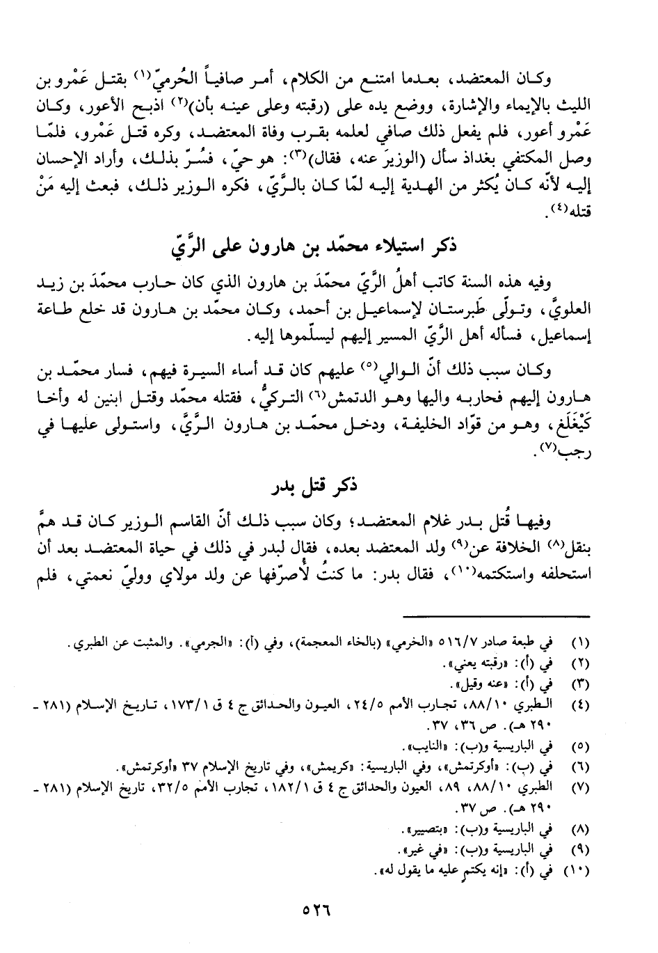 وَفِيهَا قُتِلَ بَدْرٌ غُلَامُ الْمُعْتَضِدِ، وَكَانَ سَبَبُ ذَلِكَ أَنَّ الْقَاسِمَ الْوَزِيرَ كَانَ قَدْ هَمَّ بِنَقْلِ الْخِلَافَةِ عَنْ وَلَدِ الْمُعْتَضِدِ بَعْدَهُ، فَقَالَ لِبَدْرٍ، فِي ذَلِكَ فِي حَيَاةِ الْمُعْتَضِدِ بَعْدَ أَنِ اسْتَحْلَفَهُ وَاسْتَكْتَمَهُ، فَقَالَ بَدْرٌ: مَا كُنْتُ لِأَصْرِفَهَا عَنْ وَلَدِ مَوْلَايَ وَوَلِيِّ نِعْمَتِي، فَلَمْ