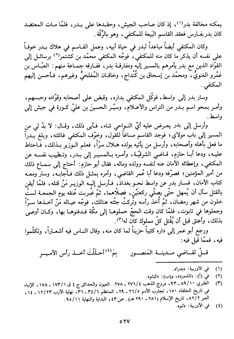 وَأَرْسَلَ إِلَى بَدْرٍ يَعْرِضُ عَلَيْهِ أَيَّ النَّوَاحِي شَاءَ، فَأَبَى ذَلِكَ، وَقَالَ: لَا بُدَّ لِي مِنَ الْمَسِيرِ إِلَى بَابِ مَوْلَايَ ; فَوَجَدَ الْقَاسِمُ مَسَاغًا لِلْقَوْلِ، وَخَوَّفَ الْمُكْتَفِي غَائِلَتَهُ، وَبَلَغَ بَدْرًا مَا فُعِلَ بِأَهْلِهِ وَأَصْحَابِهِ، وَأَرْسَلَ مَنْ يَأْتِيهِ بِوَلَدِهِ هِلَالٍ سِرًّا، فَعَلِمَ الْوَزِيرُ بِذَلِكَ فَاحْتَاطَ عَلَيْهِ وَدَعَا أَبَا حَازِمٍ قَاضِيَ الشَّرْقِيَّةِ، وَأَمَرَهُ بِالْمَسِيرِ إِلَى بَدْرٍ، وَتَطْيِيبِ نَفْسِهِ عَلَى الْمُكْتَفِي، وَإِعْطَائِهِ الْأَمَانَ عَنْهُ لِنَفْسِهِ وَوَلَدِهِ وَمَالِهِ، فَقَالَ لَهُ أَبُو حَازِمٍ: أَحْتَاجُ إِلَى سَمَاعِ ذَلِكَ مِنْ أَمِيرِ الْمُؤْمِنِينَ ; فَصَرَفَهُ، وَدَعَا أَبَا عُمَرَ الْقَاضِيَ، وَأَمَرَهُ بِمِثْلِ ذَلِكَ فَأَجَابَهُ، وَسَارَ وَمَعَهُ كِتَابُ الْأَمَانِ. فَسَارَ بَدْرٌ عَنْ وَاسِطَ نَحْوَ بَغْدَاذَ، فَأَرْسَلَ إِلَيْهِ الْوَزِيرُ مَنْ قَتَلَهُ، فَلَمَّا أَيْقَنَ بِالْقَتْلِ سَأَلَ أَنْ يُمْهَلَ حَتَّى يُصَلِّيَ رَكْعَتَيْنِ، فَصَلَّاهُمَا ثُمَّ ضُرِبَتْ عُنُقُهُ يَوْمَ الْجُمُعَةِ لِسِتٍّ خَلَوْنَ مِنْ شَهْرِ رَمَضَانَ. ثُمَّ أُخِذَ رَأْسُهُ وَتُرِكَتْ جُثَّتُهُ هُنَالِكَ، فَوَجَّهَ عِيَالُهُ مَنْ أَخَذَهَا سِرًّا وَجَعَلُوهَا فِي تَابُوتٍ. فَلَمَّا كَانَ وَقْتُ الْحَجِّ حَمَلُوهَا إِلَى مَكَّةَ فَدَفَنُوهَا بِهَا وَكَانَ أَوْصَى بِذَلِكَ، وَأَعْتَقَ قَبْلَ أَنْ يُقْتَلَ كُلَّ مَمْلُوكٍ كَانَ لَهُ.
