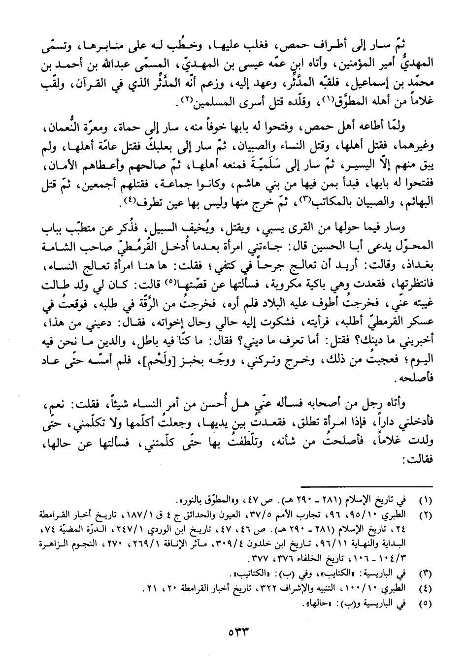 وَسَارَ فِيمَا حَوْلَهَا مِنَ الْقُرَى يَسْبِي، وَيَقْتُلُ وَيُخِيفُ السَّبِيلَ. فَذُكِرَ عَنْ مُتَطَبِّبٍ بِبَابِ الْمُحَوَّلِ يُدْعَى أَبَا الْحُسَيْنِ قَالَ: جَاءَتْنِي امْرَأَةٌ بَعْدَمَا أُدْخِلَ الْقَرْمَطِيُّ صَاحِبُ الشَّامَةِ بَغْدَادَ، وَقَالَتْ: أُرِيدُ أَنْ تُعَالِجَ جُرْحًا فِي كَتِفِي ; فَقُلْتُ: هَهُنَا امْرَأَةٌ تُعَالِجُ النِّسَاءَ فَانْتَظَرَتْهَا، فَقَعَدَتْ وَهِيَ بَاكِيَةٌ مَكْرُوبَةٌ، فَسَأَلْتُهَا عَنْ قِصَّتِهَا قَالَتْ: كَانَ لِي وَلَدٌ طَالَتْ غَيْبَتُهُ عَنِّي، فَخَرَجْتُ أَطُوفُ عَلَيْهِ الْبِلَادَ، فَلَمْ أَرَهُ، فَخَرَجْتُ مِنَ الرَّقَّةِ فِي طَلَبِهِ، فَوَقَعْتُ فِي عَسْكَرِ الْقَرْمَطِيِّ أَطْلُبُهُ، فَرَأَيْتُهُ، فَشَكَوْتُ إِلَيْهِ حَالِي وَحَالَ إِخْوَتِهِ، فَقَالَ: دَعِينِي مِنْ هَذَا، أَخْبِرِينِي مَا دِينُكِ؟ فَقُلْتُ: أَمَا تَعْرِفُ مَا دِينِي؟ فَقَالَ: مَا كُنَّا فِيهِ بَاطِلٌ، وَالدِّينُ مَا نَحْنُ فِيهِ الْيَوْمَ، فَعَجِبْتُ مِنْ ذَلِكَ، وَخَرَجَ وَتَرَكَنِي، وَوَجَّهَ بِخُبْزٍ [وَلَحْمٍ] فَلَمْ أَمَسَّهُ، حَتَّى عَادَ فَأَصْلَحَهُ.