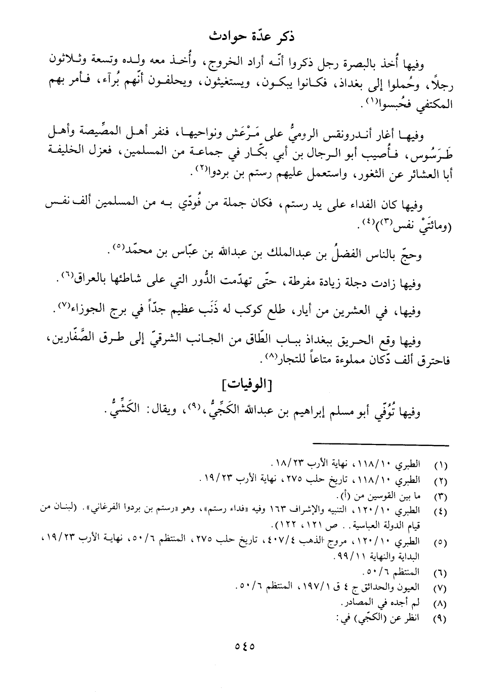 وَفِيهَا أَغَارَ أَنْدُرُونِقْسُ الرُّومِيُّ عَلَى مَرْعَشَ وَنَوَاحِيهَا، فَنَفَّرَ أَهْلَ الْمِصِّيصَةِ وَأَهْلَ طَرَسُوسَ فَأُصِيبَ أَبُو الرِّجَالِ بْنُ أَبِي بَكَّارٍ فِي جَمَاعَةٍ مِنَ الْمُسْلِمِينَ، فَعَزَلَ الْخَلِيفَةُ أَبَا الْعَشَائِرِ عَنِ الثُّغُورِ، وَاسْتَعْمَلَ عَلَيْهِمْ رُسْتُمَ بْنَ بَرَدُوَا.