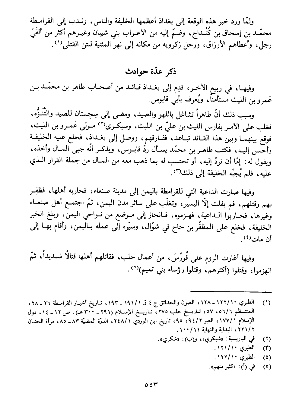 وَفِيهَا، فِي رَبِيعٍ الْآخَرِ، قَدِمَ إِلَى بَغْدَاذَ قَائِدٌ مِنْ أَصْحَابِ طَاهِرِ بْنِ مُحَمَّدِ بْنِ عَمْرِو بْنِ اللَّيْثِ مُسْتَأْمِنًا، وَيُعْرَفُ بِأَبِي قَابُوسَ.